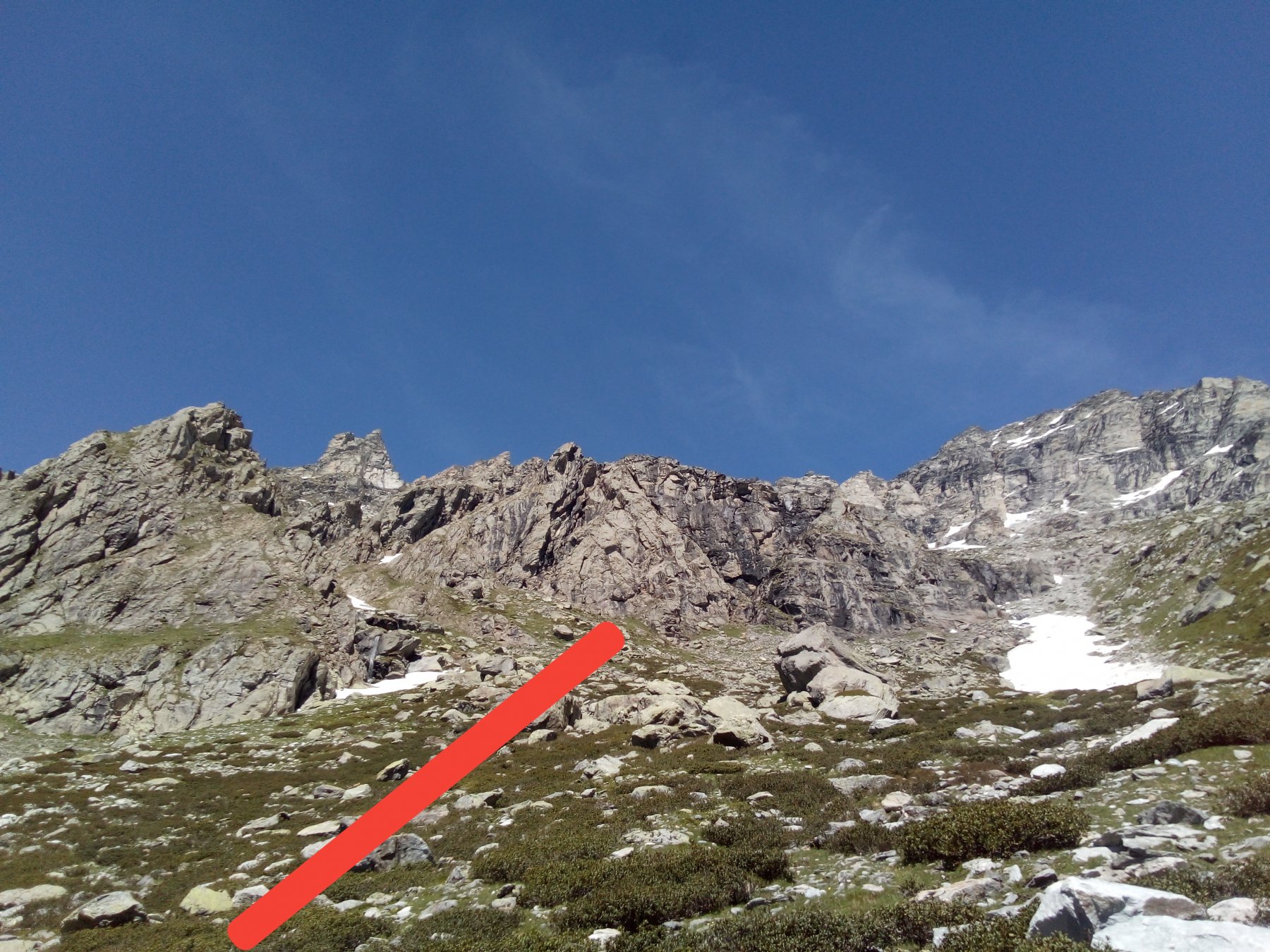 | diebra | La parete vista dal piano, in rosso la direzione di salita e il punto di attacco