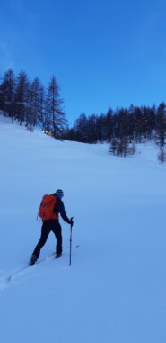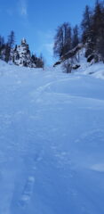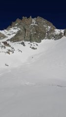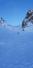 Tracciato in neve polverosa fino all'imbocco (non ben evidente fino all'ultimo). Il canale ha già scaricato nella parte superiore, si alternano tratti di neve dura…