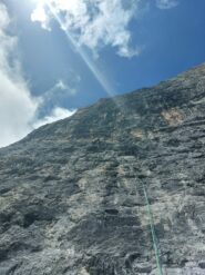 La partenza si individua bene, è il secondo diedro a sinistra del tetto giallo. Primo chiodo ben visibile e moschettonabile coi piedi su cumulo di…
