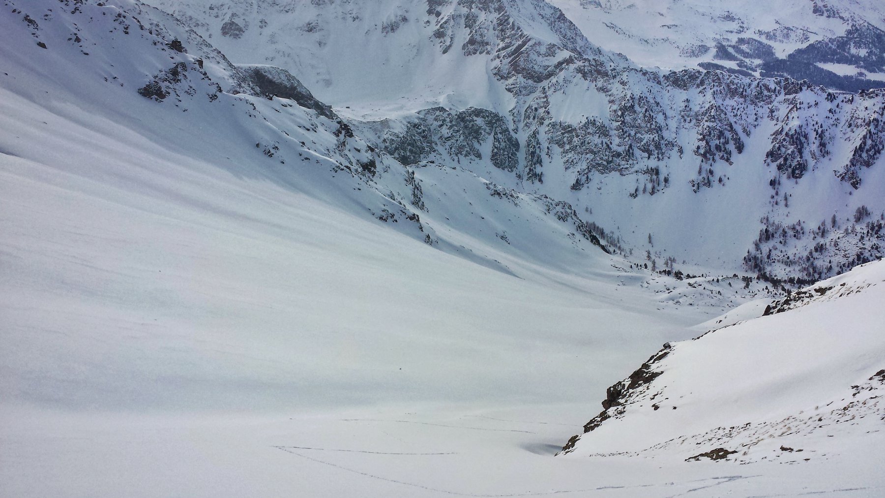 Neve atomica, polvere lungo tutto il canale. Rialzo vertiginoso della temperatura nel pomeriggio che ne ha compromesso le condizioni. Dal basso si notavano grossi distacchi…