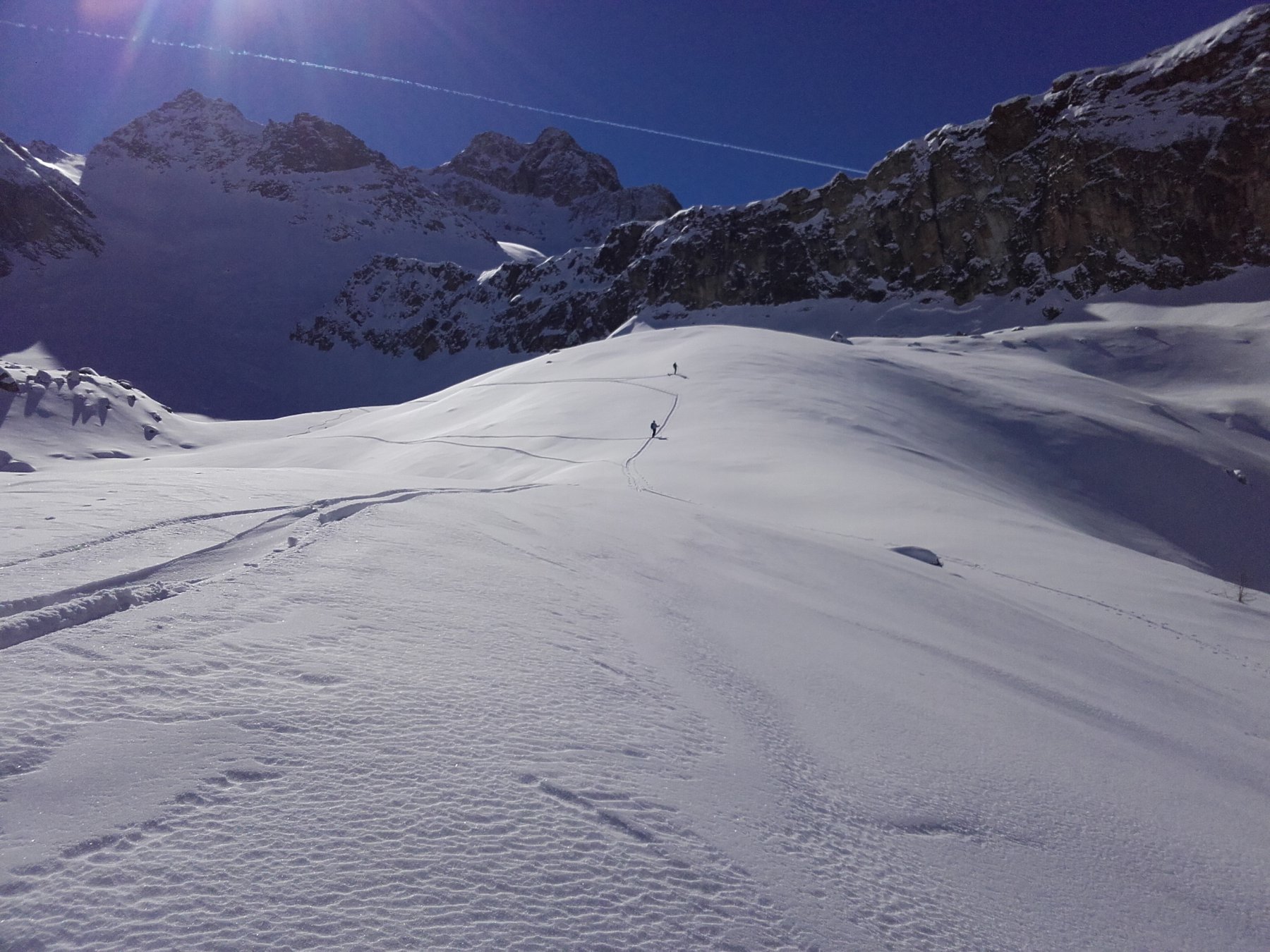 Ottima neve dalla casetta fino alla conca,per arrivare in cima tocca togliere gli sci perché il vento continua a soffiare.con Paolo e Diego