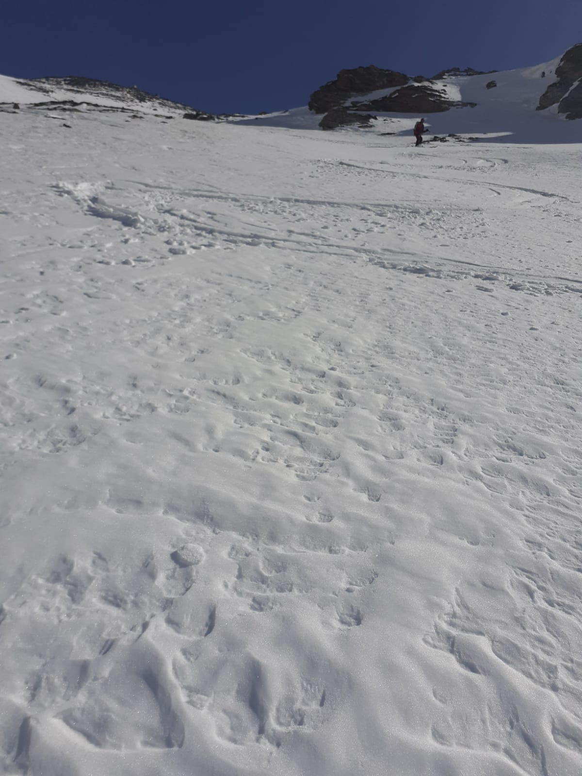 Calzati gli sci alla partenza, e tolti a pochi metri dalla cima. Neve dura e lavorata dal vento in alto, e bagnata marcia in basso.…