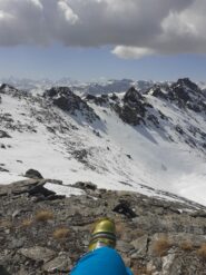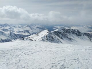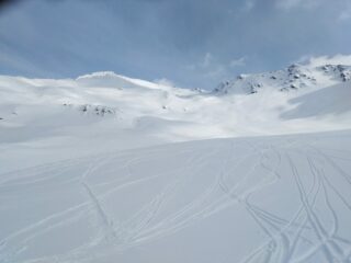 Partiti sci ai piedi, abbiamo seguito il vallone fino a baita Gimont, poi proseguito sullo stradino e raggiunta la vetta da destra. Discesa piacevole,…