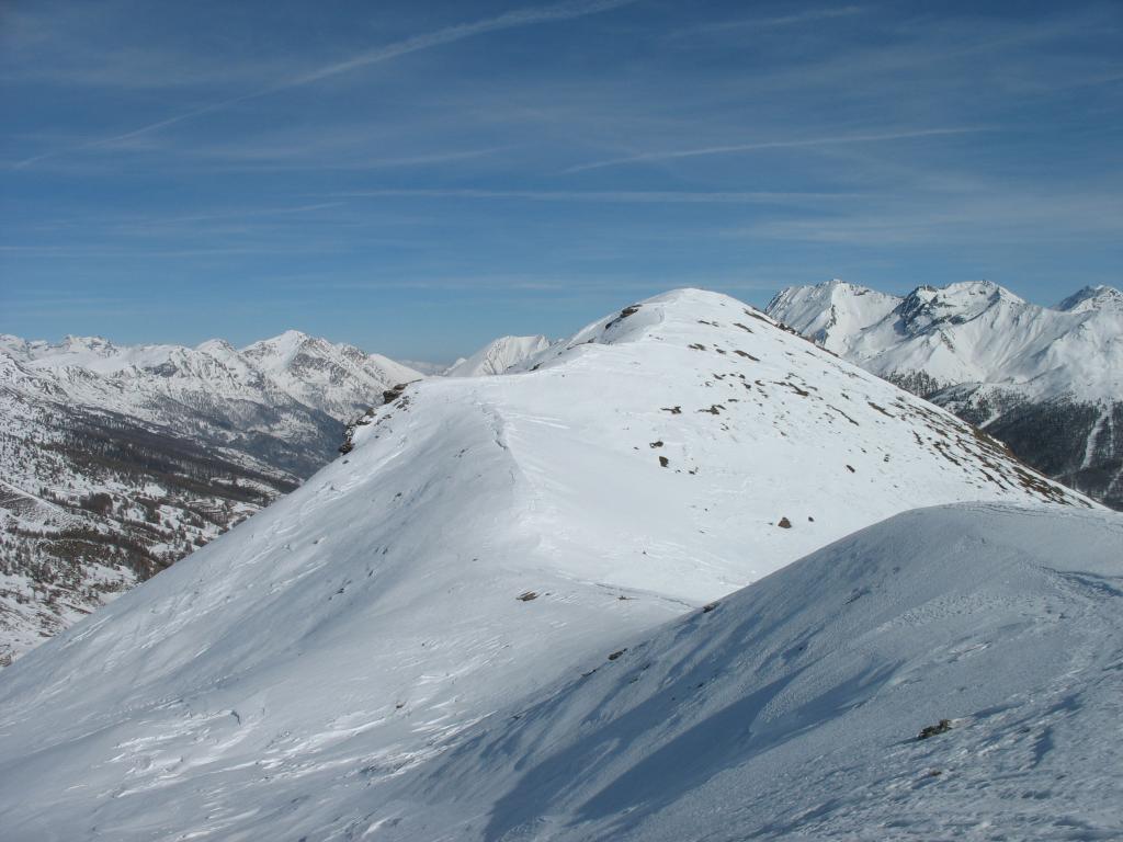 | emilius | dopo la partenza della seggiovia | emilius | sulla destra il vallone di salita | emilius | il pendio lavorato dal vento | emilius | un bel tratto in discesa | emilius | risaliamo la cresta per la discesa | emilius | cerchiamo riparo sotto la punta