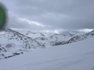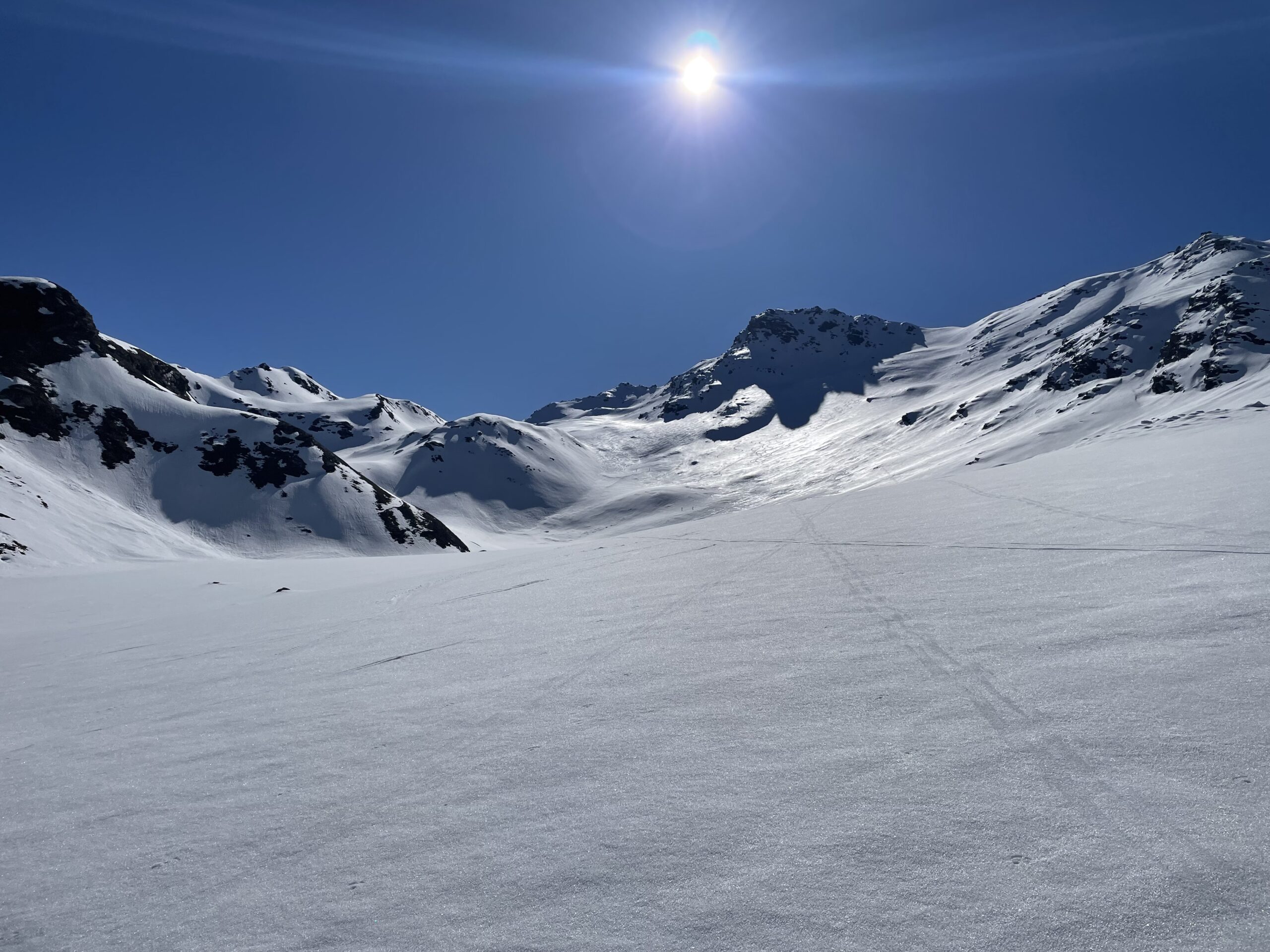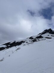 In auto fino al rifugio. 15 minuti di portage per alcuni tornanti, poi sci nei piedi con neve continua fino in punta. Discesa alle 11.30, prima parte…