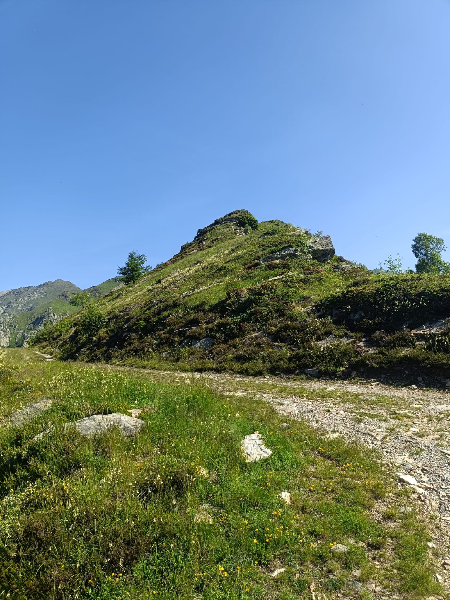 Non ho trovato le tacche blu per l'attacco. Ho perciò proseguito lungo il sentiero fino a trovare un punto dove era più o meno agevole…