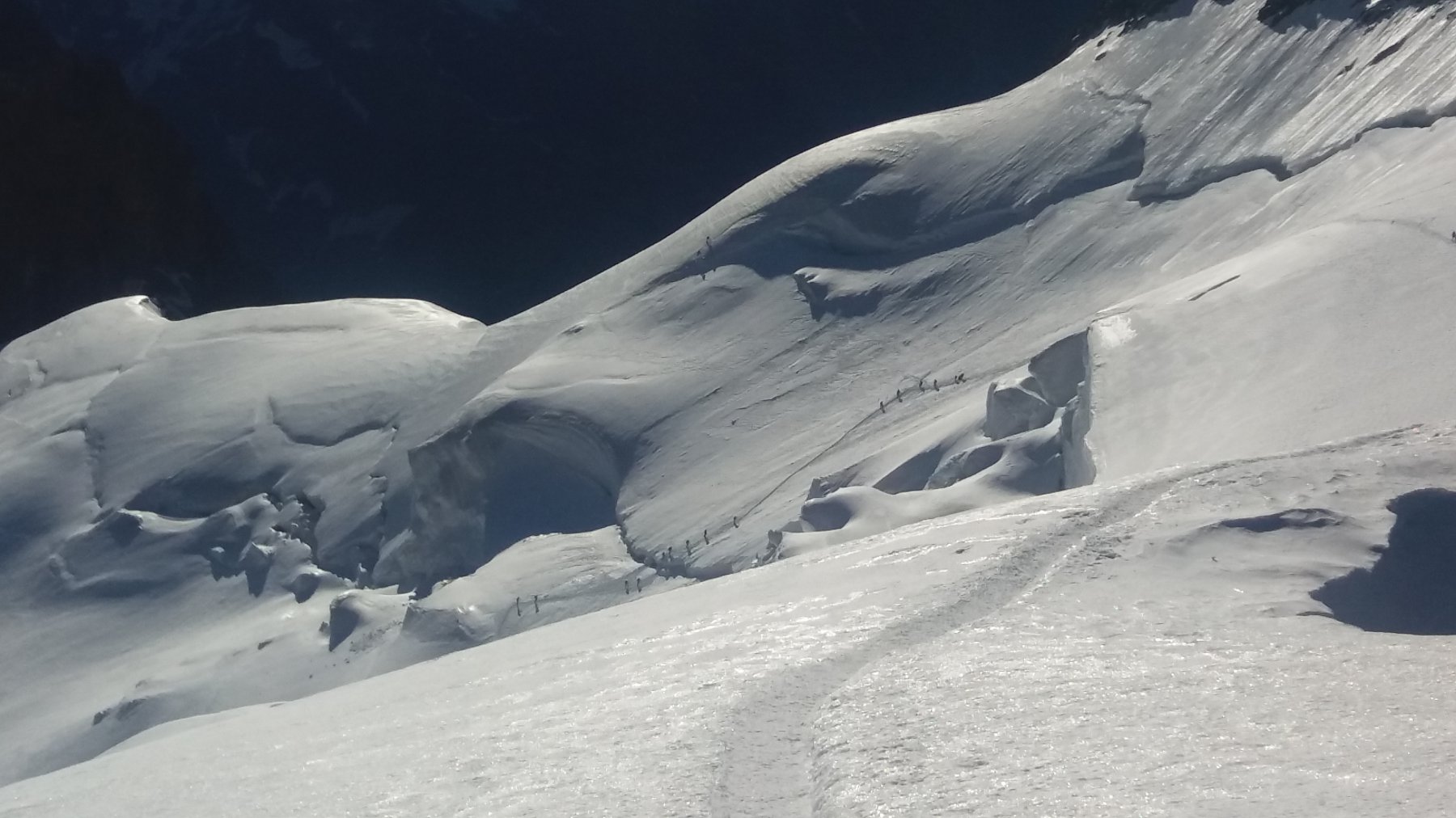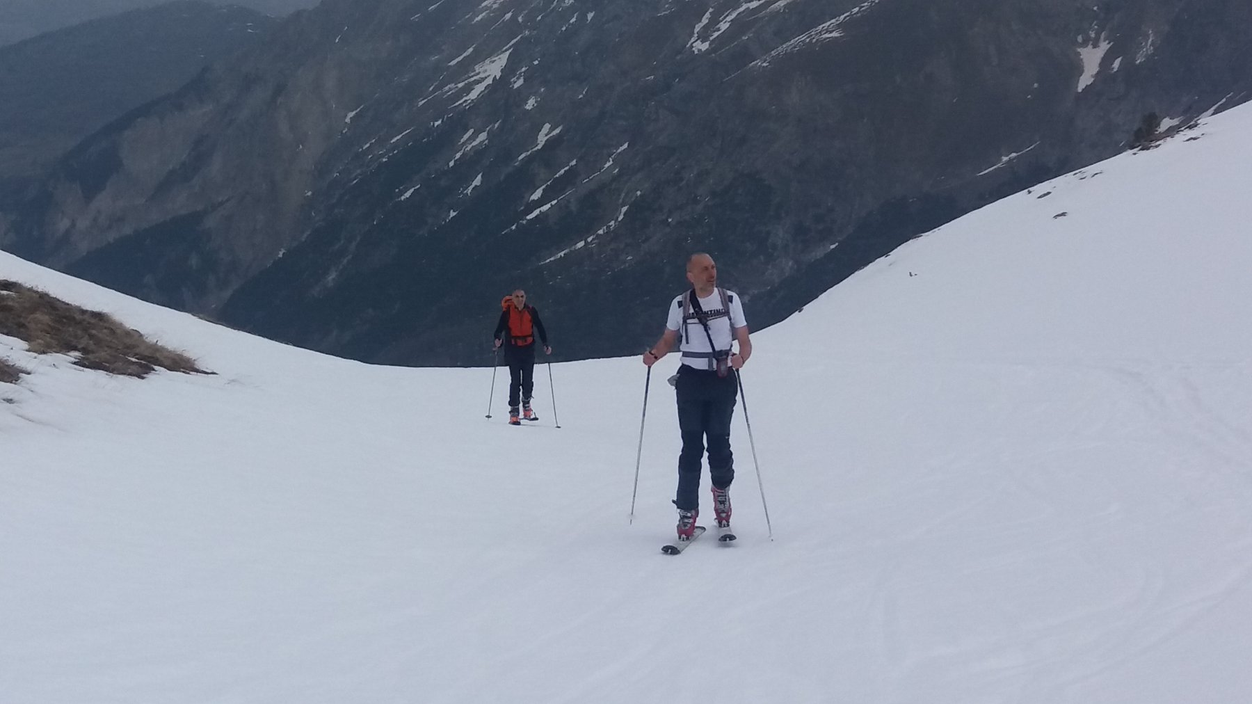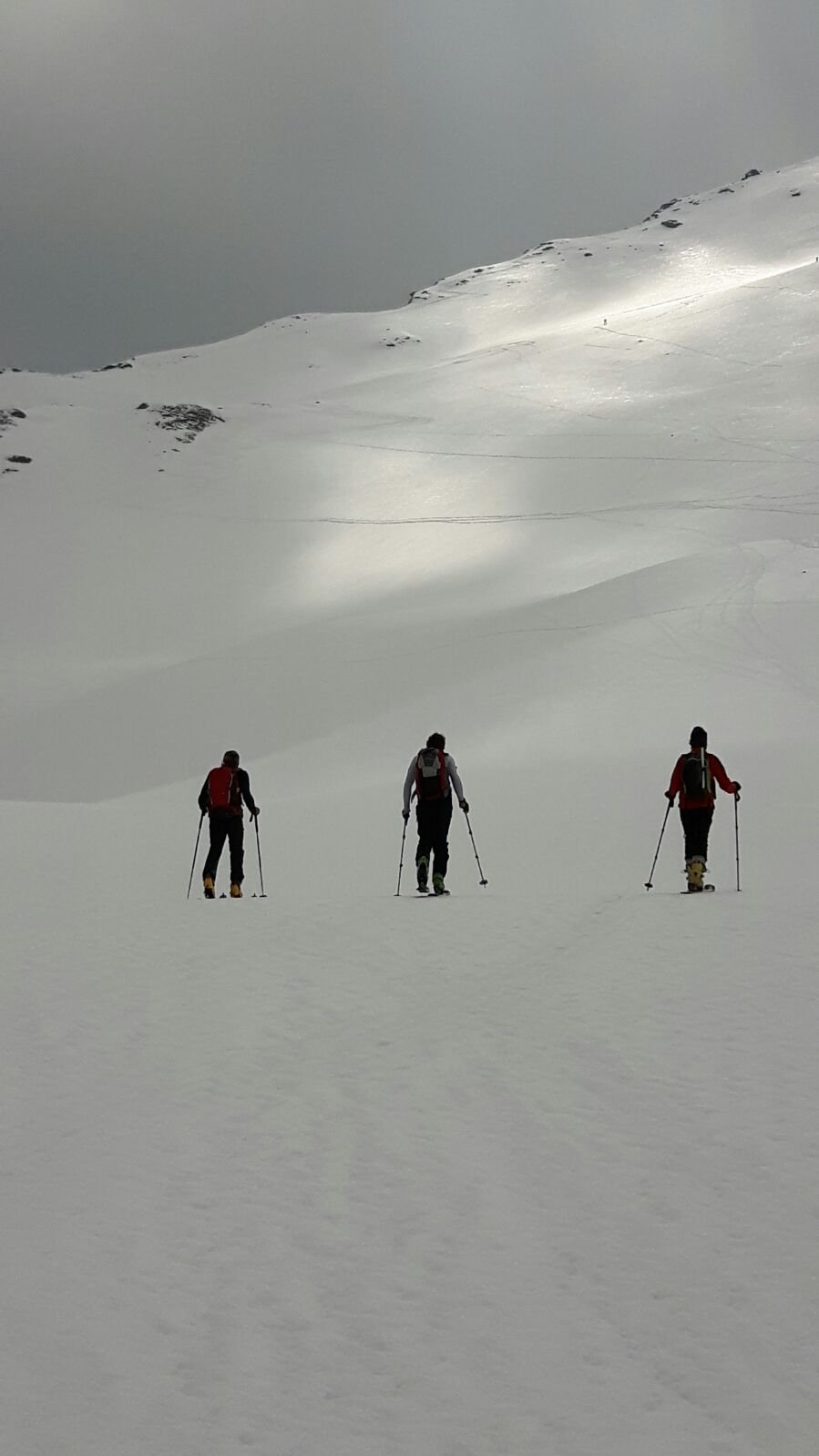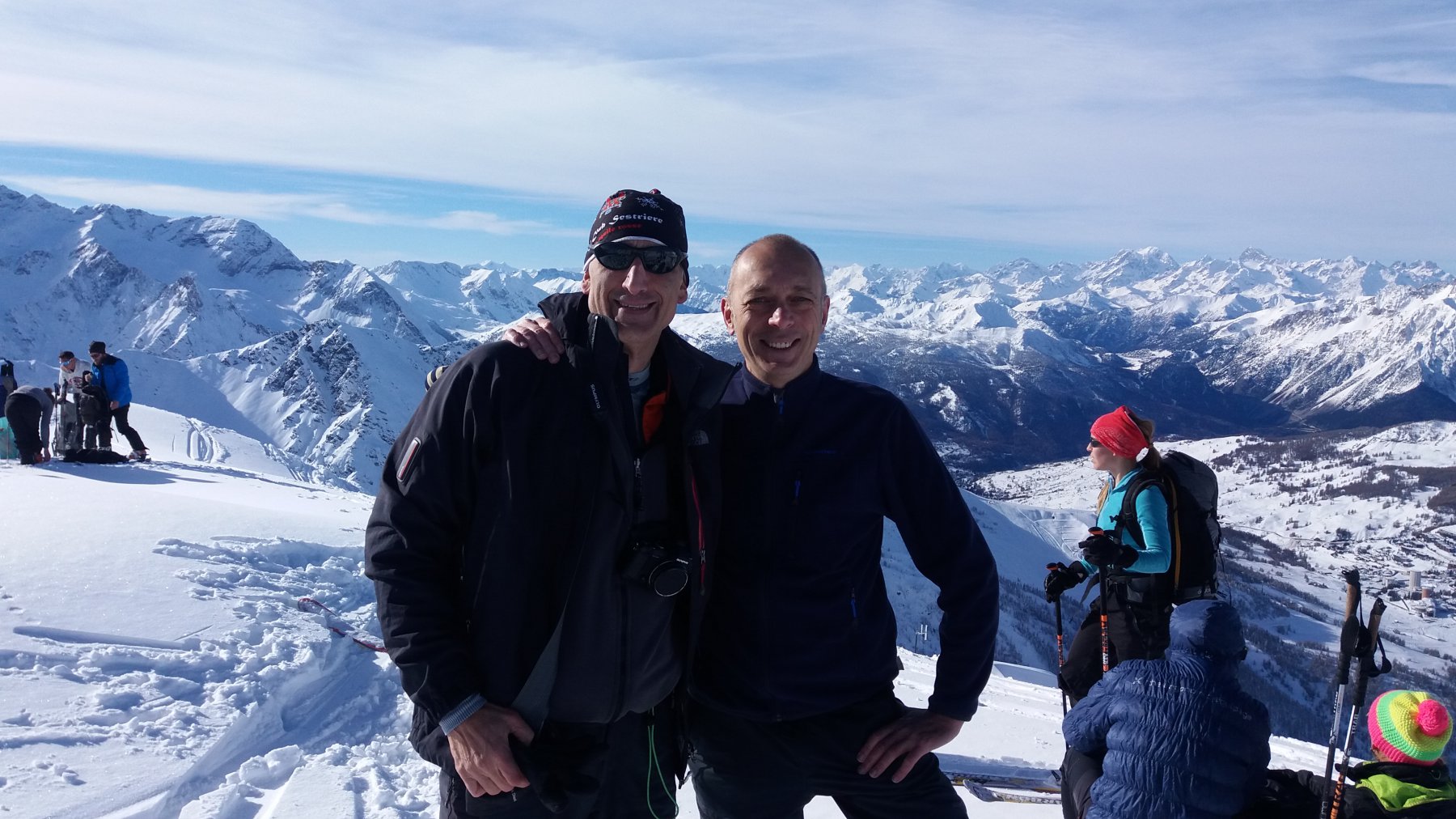 | enrico | Verso la cima ormai vicina. Pendio punteggiato di sciatori | enrico | Dalla cima, sguardo verso valle Orco e pianura (nebbiosa) | enrico | Scendendo, la folla si fa piu' densa