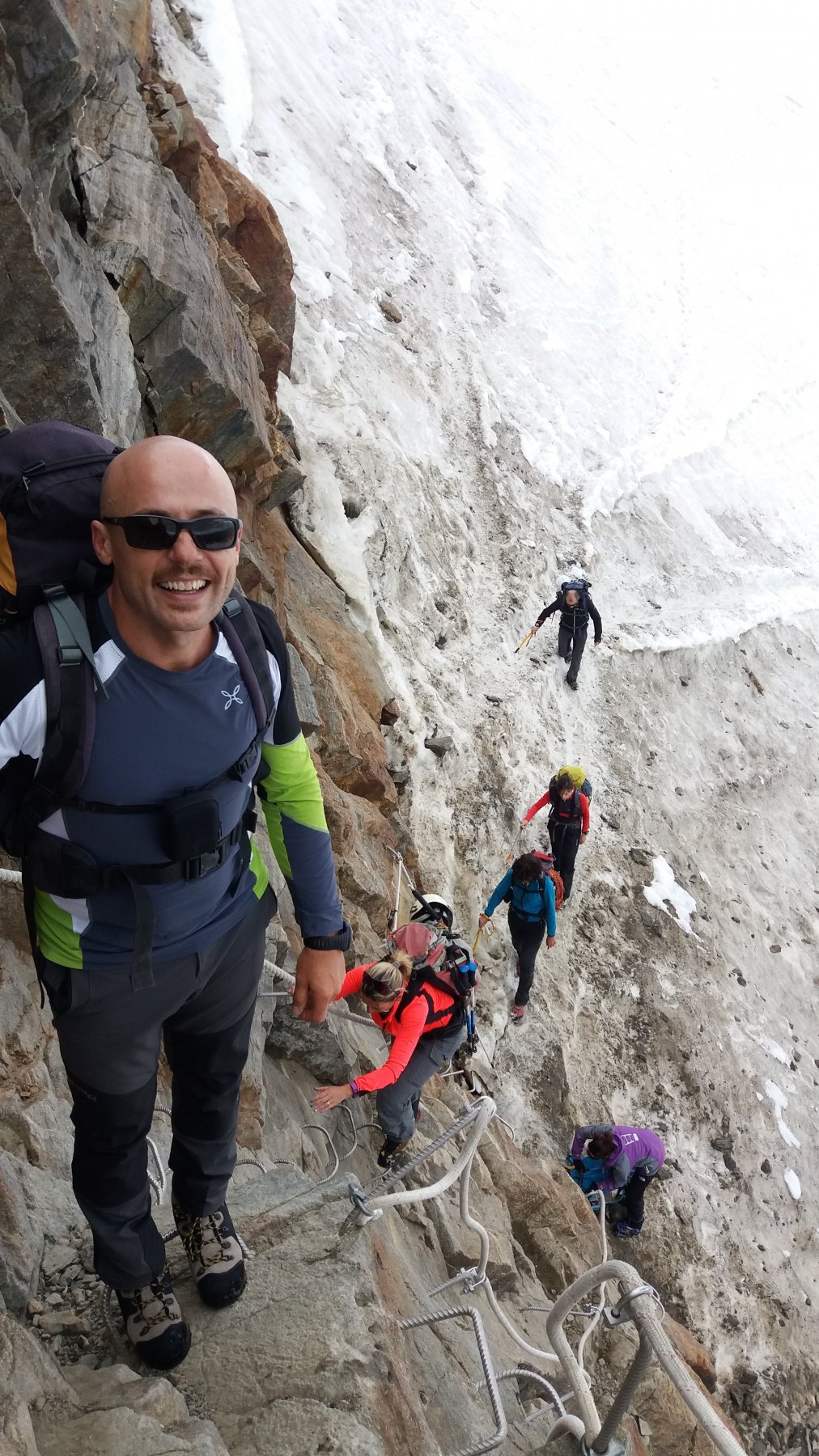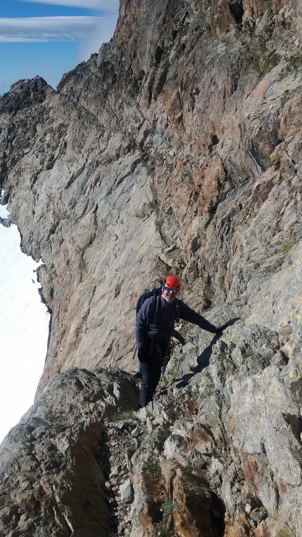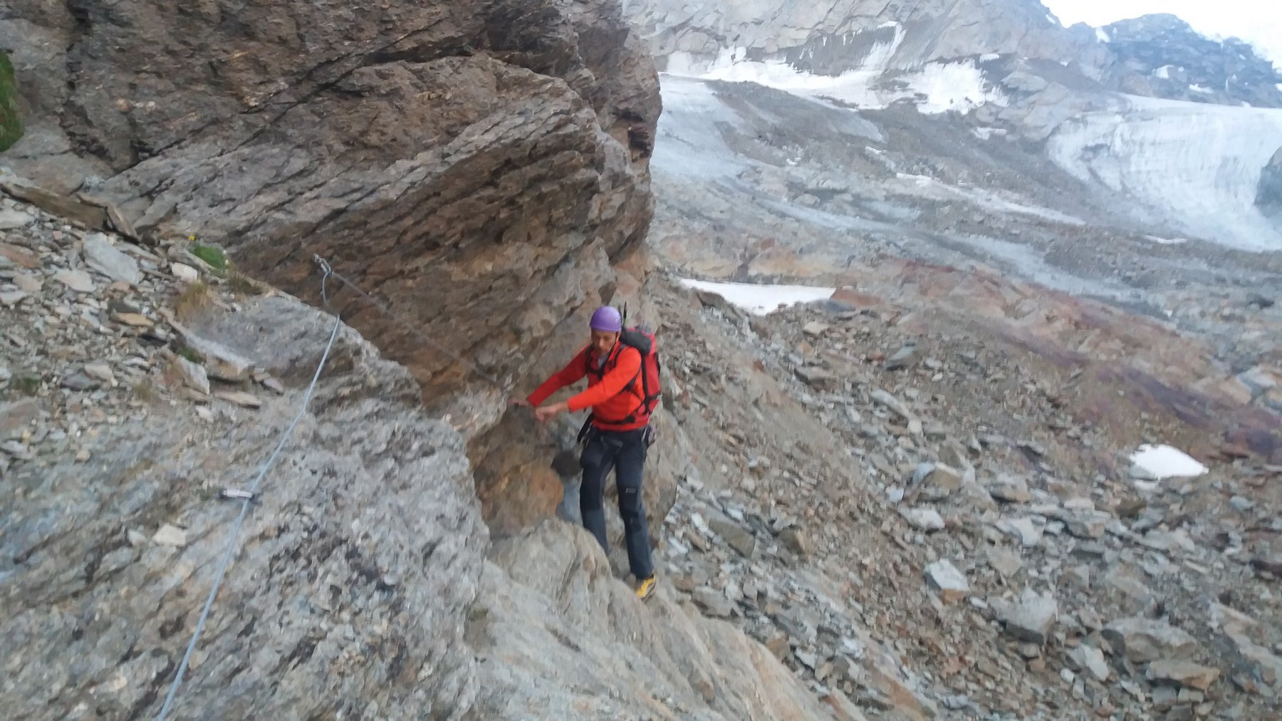 | enrico | Condizioni della montagna (cresta di salita a sx) | enrico | Traverso con cavetto d' acciaio per raggiungere il ghiacciaio | enrico | Tipico terreno in salita | enrico | Davide in vetta | enrico | E ci sono anch' io | enrico | Versante di salita, Saas Fee in fondo e gruppo Mischabel sullo sfondo