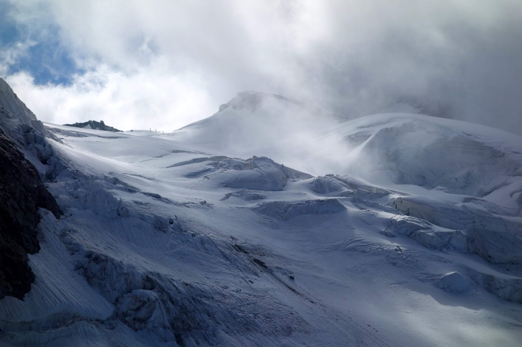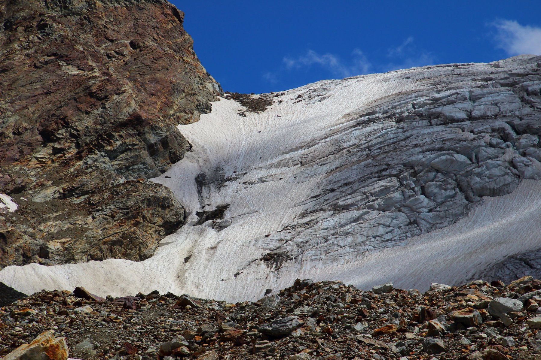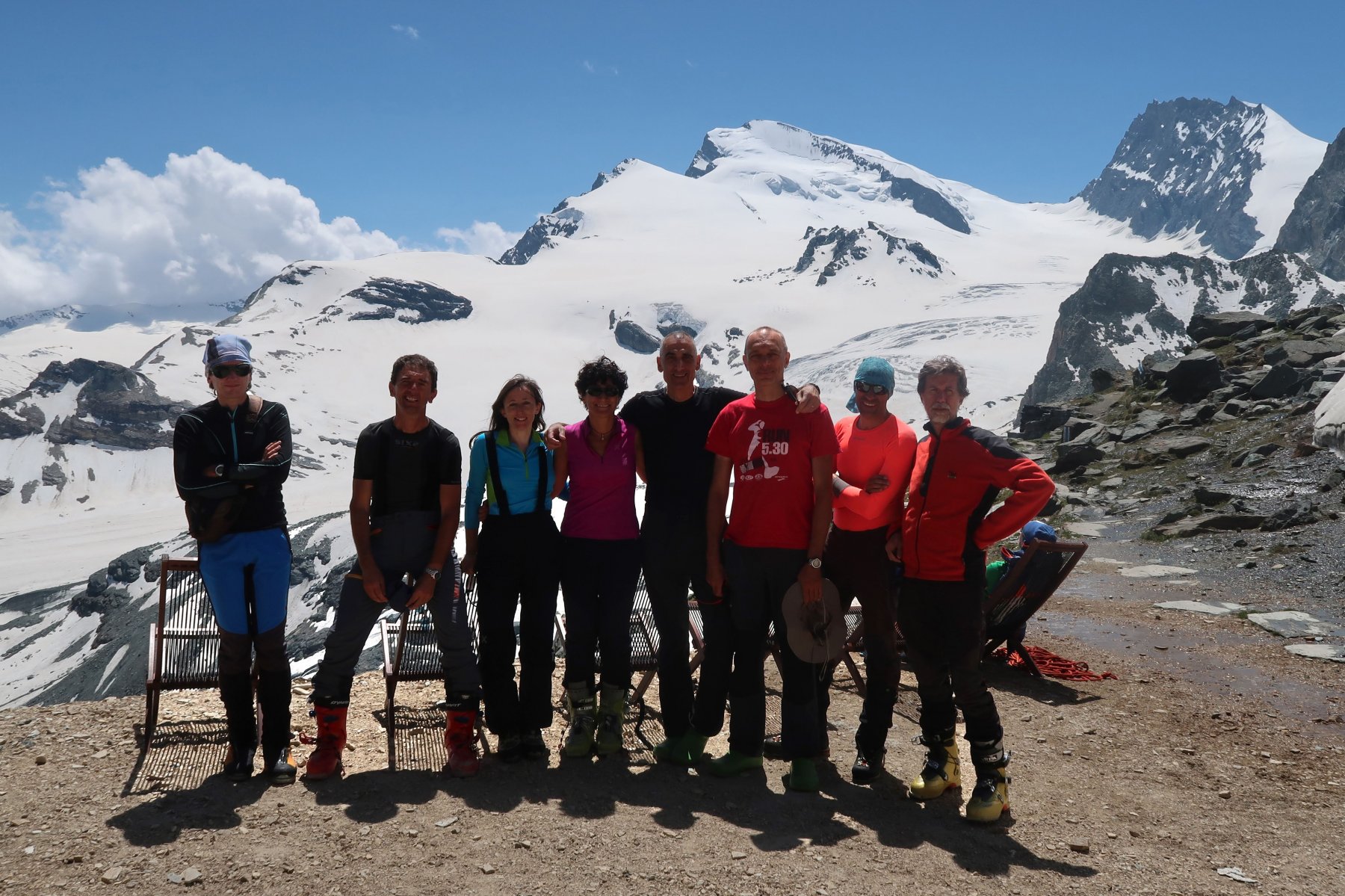 | enrico | Nei pressi del bivacco | enrico | Fotografati da un'alpinista che si trovava sulla Tiefenmatten | enrico | In discesa, con la Dent d'Herens che incombe | enrico | Il poco attraente accesso al ghiacciaio (foto Luca P.)