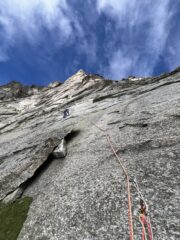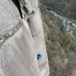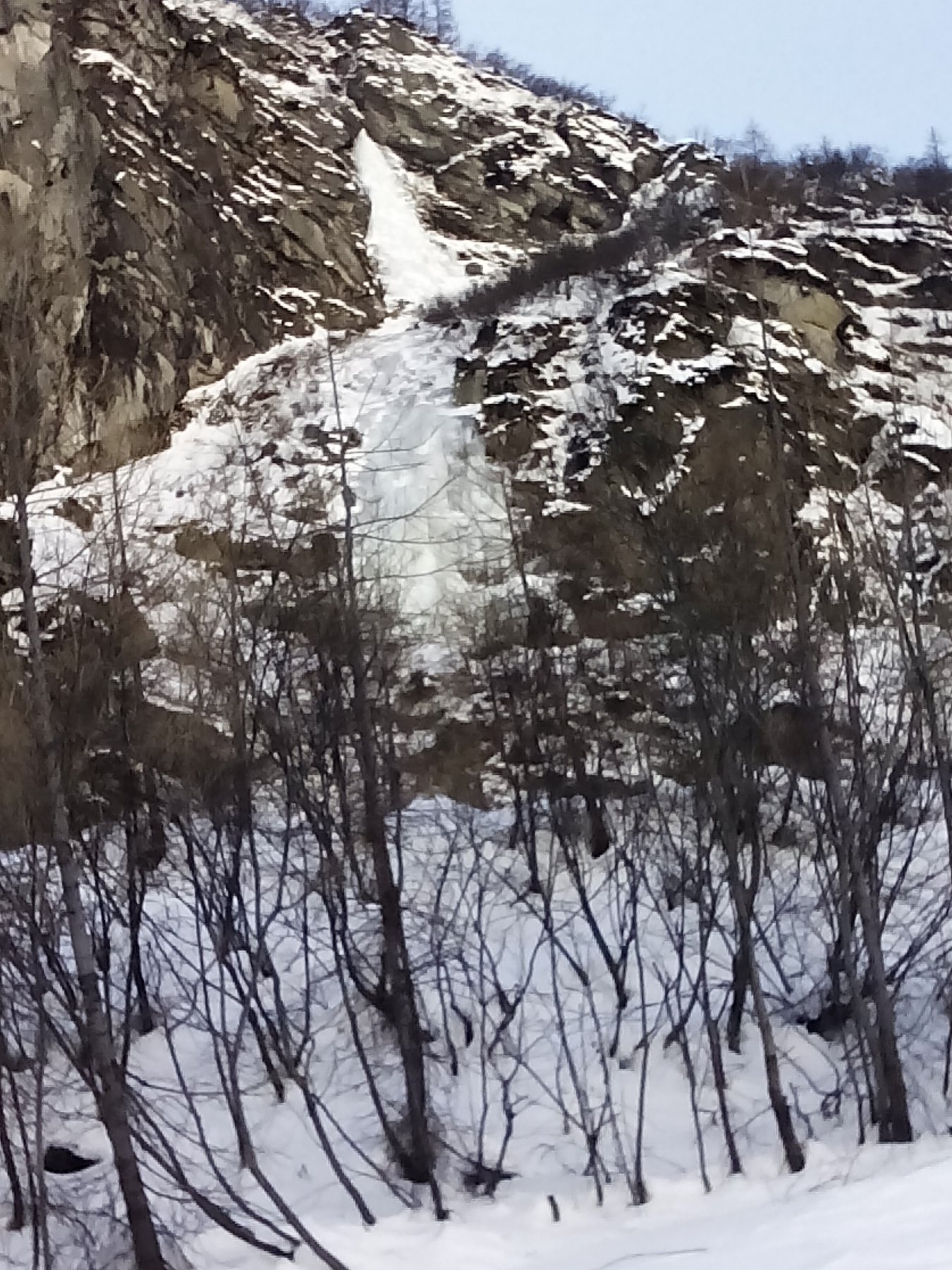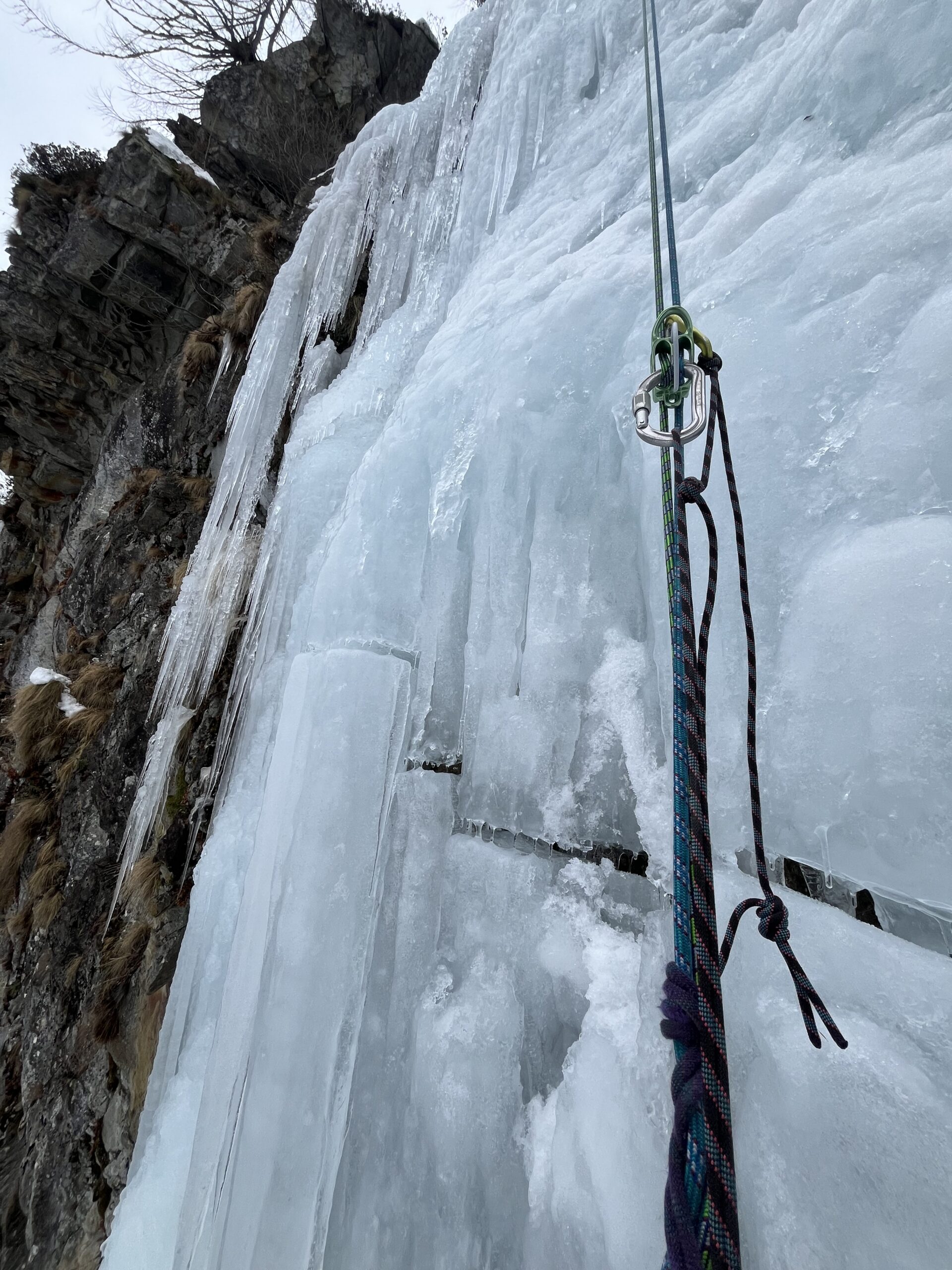 Primo tiro con una bella sezione verticale poi conviene far sosta su ghiaccio e far un secondo tiro in traverso ascendente verso sx fino alla…