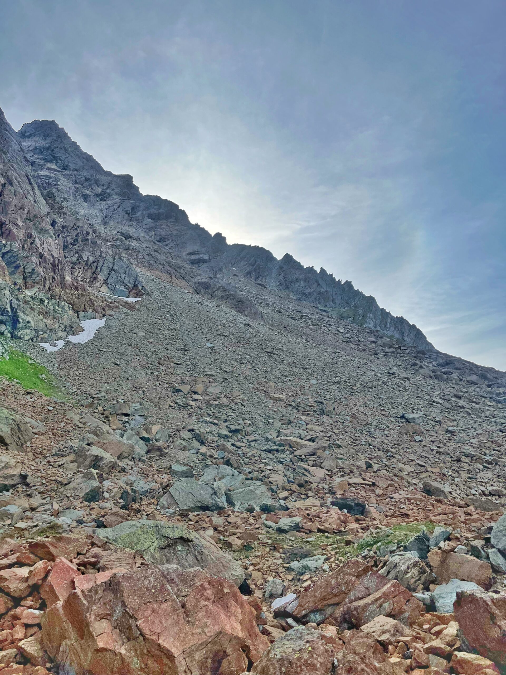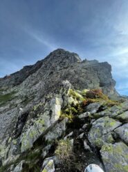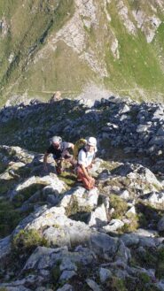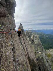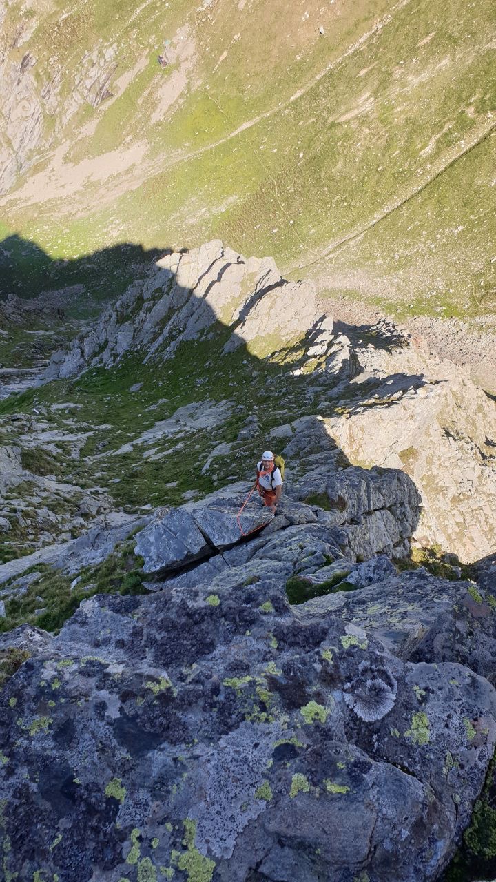 Cresta evidente, roccia molto buona sul filo fino a poco dopo la calata, poi tratto di blocchi instabili fino al camino finale… Sosta di calata: chiodi…
