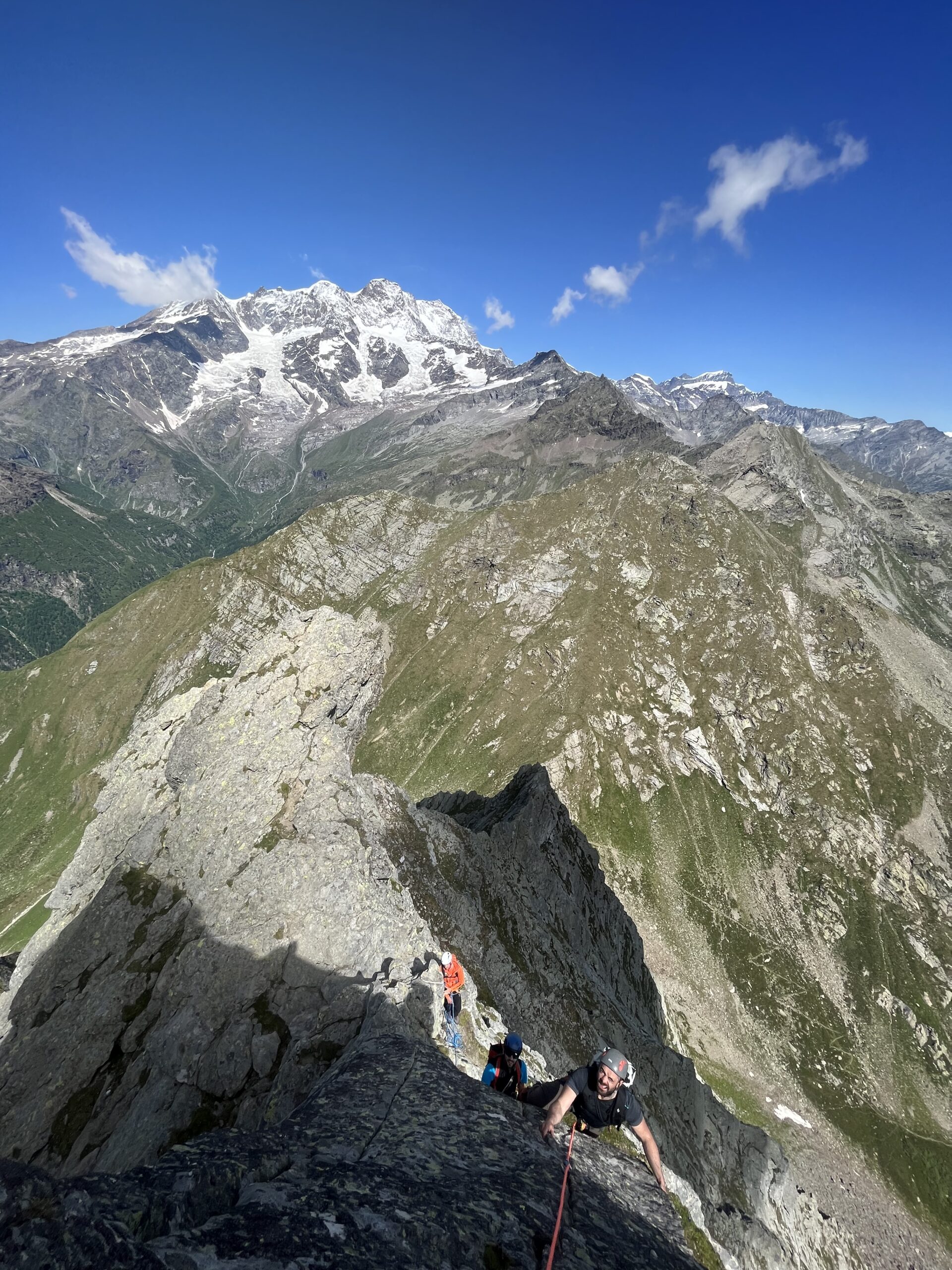 Bella salita classica al cospetto del Rosa, tranquillamente fattibile in giornata da Rima, si percorre tutta in conserva tranne il tiro di V… roccia bella…