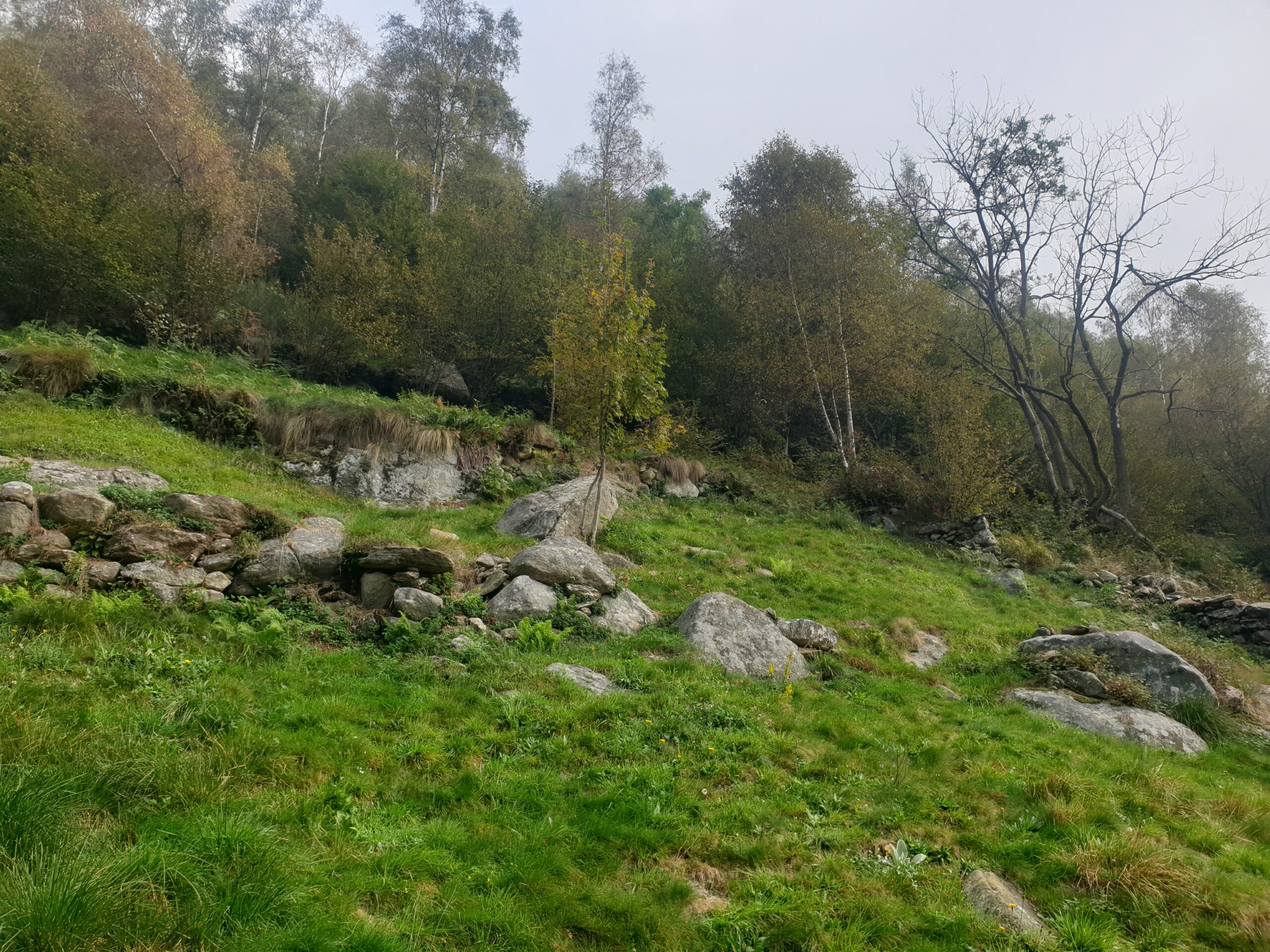 | erminio | Alpe Raja, dove si lascia la sterrata. | erminio | Inizio traccia | erminio | La pietraia durante l'avvicinamento | erminio | Attacco della via con scritta sbiadita | erminio | La mettono tutti, non potevamo non metterla anche noi la foto dell'ultimo tiro :-)