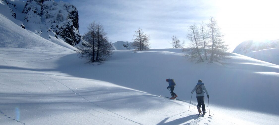 Avvicinamento fino alla base della parete W sempre su fondo duro, completamente trasformato. La prima parte dello scivolo, svolto a destra di tratto slavinato, con neve…