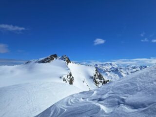 Raggiunto cima dopo aver salito Ruitor e ridiscesi su ghiacciaio versante La Thuile. Parete in buone condizioni anche se canale a metá discesa comincia a diventare…