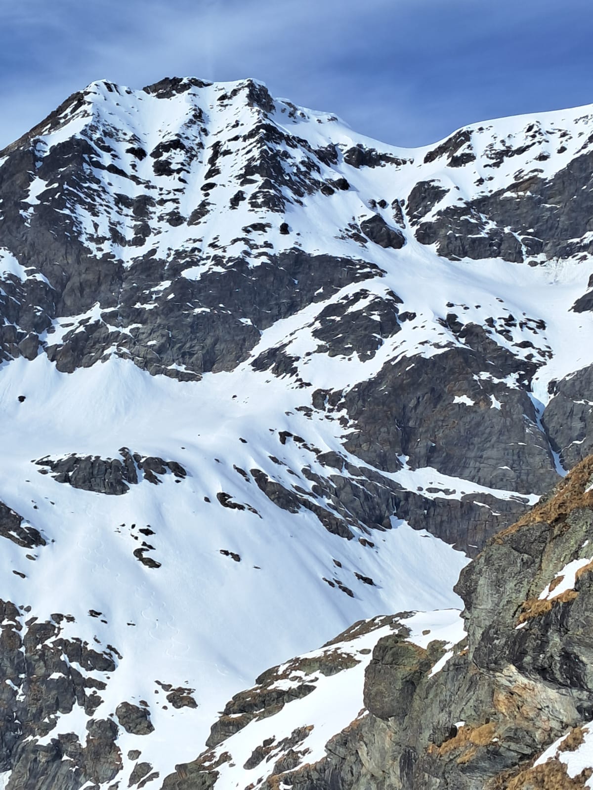 Parete in condizione a parte ultimi 50 con pietre sempre in agguato. Tracciato il pendio a sx del canale centrale su 30 cm di farina…