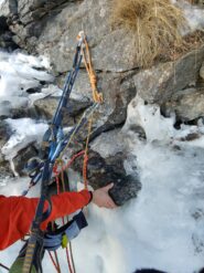 Le temperature al limite hanno recuperato la superficie del ghiaccio chiudendo quasi tutti i passaggi delle precedenti cordate. La sosta è messa su un blocco grande…