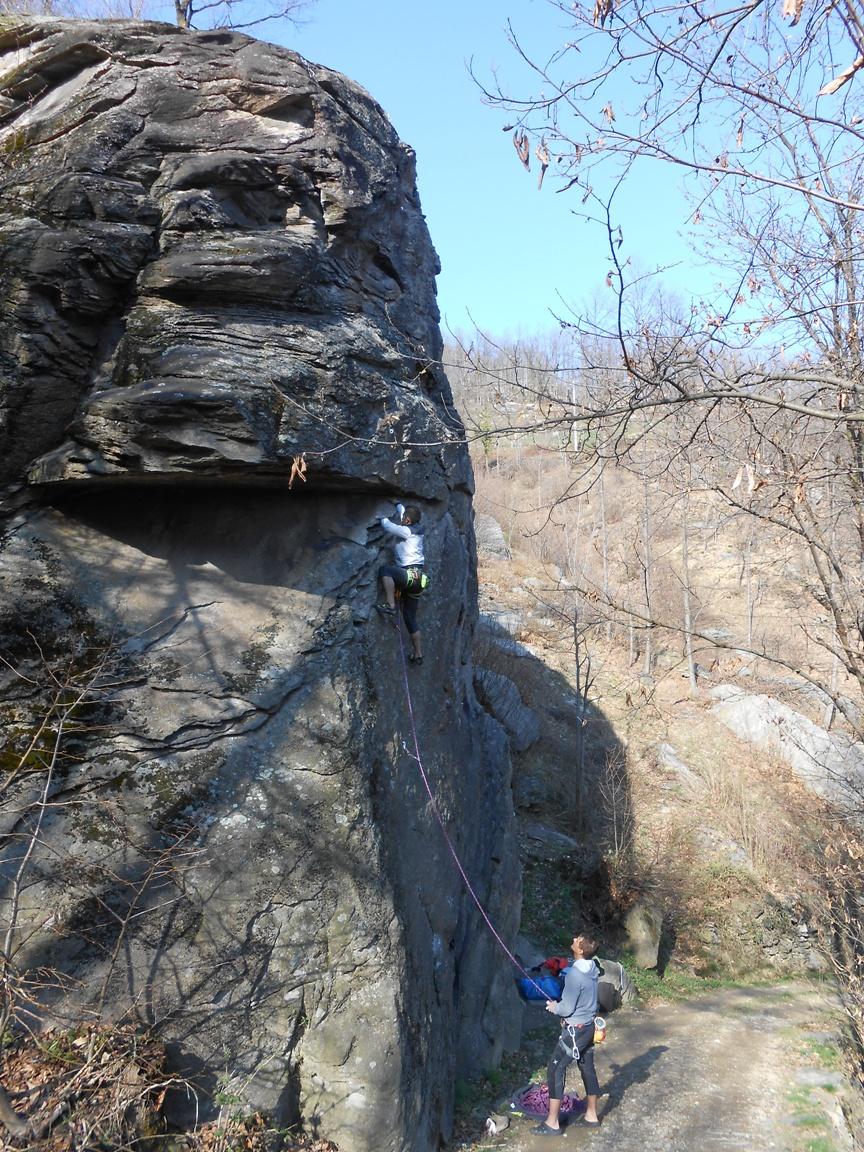 Prima viuzza di giornata, roccia ancora un pelo fredda. Per scalarla al meglio bisogna immaginare di indossare gli scarponi e di conseguenza ignorare abbastanza la linea…