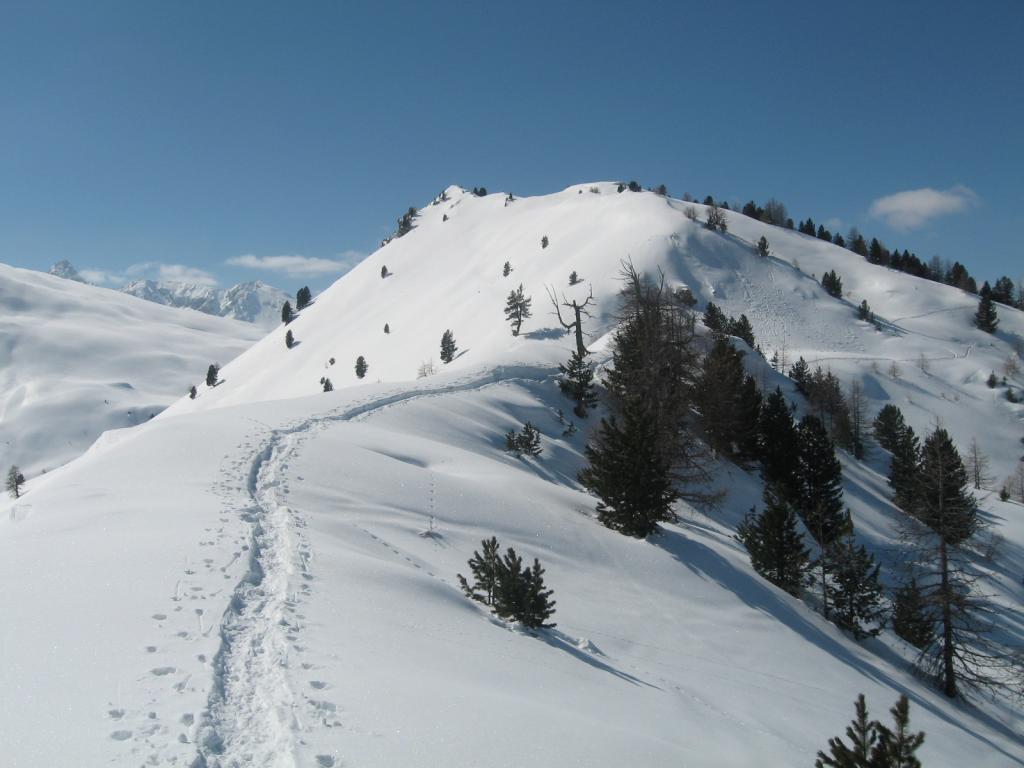 Dall'Alpe Mustione in caso di mancanza di traccia, con innevamento che copre le paline, procedere con attenzione, soprattutto nell'ultimo traverso prima della salita alla bastionata.