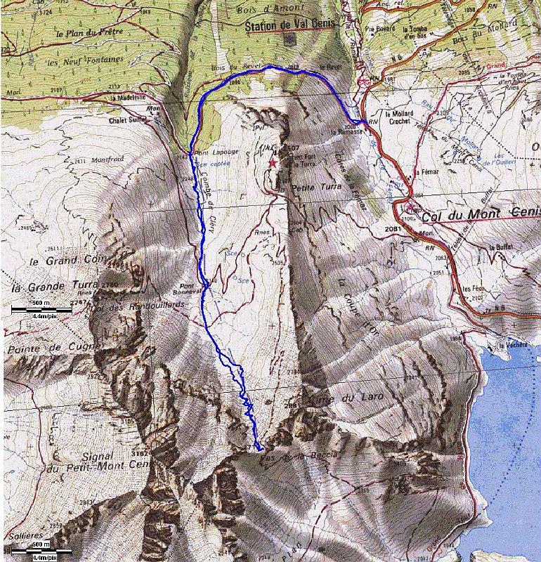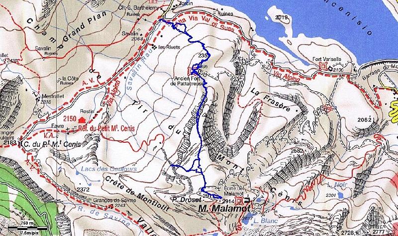 | fyplom | tratto sulla stradina | fyplom | inizio del vallone dal ponte | fyplom | prima dell'ultimo pendio | fyplom | arrivo al colle | fyplom | vista sul lago del moncenisio | fyplom | tracce di discesa | fyplom | cima du Laro | fyplom | cartina con traccia gps