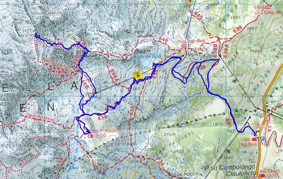 | fyplom | la valle di mesdì | fyplom | la cima con i sentieri | fyplom | cartina e traccia gps | fyplom | il lago di boa | fyplom | il sentiero visto dal rifugio, la freccia indica il punto dove vi è la scala | fyplom | la croce di vetta | fyplom | il piz boe e la valle di mesdì | fyplom | montagne vicine | fyplom | il lago di pisciadù | fyplom | zoom sul lago di pisciadù | fyplom | si arriva anche per ferrata | fyplom | il punto con la scaletta | fyplom | panorama verso la marmolada