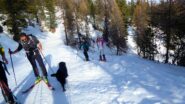 Saliti nel bosco su ottima traccia, neve dalla partenza, rifugio aperto oggi con pochi gitanti. Giornata con temperature gradevoli senza vento. Discesa provando ad uscire…