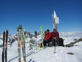 giornata stupenda,neve abbondante, traccia evidentissima, molti scialp, pendio finale in discrete condizioni,discesa con temperature estive e neve al limite dello sciabile divertimento. Visto elisoccorso…