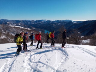Saliti da Bavastrelli su ottima traccia fino in punta. Molti ciaspolatori e qualcuno anche senza. Poco vento in vetta, vista splendida da Corsica, Apuane, Alpi…