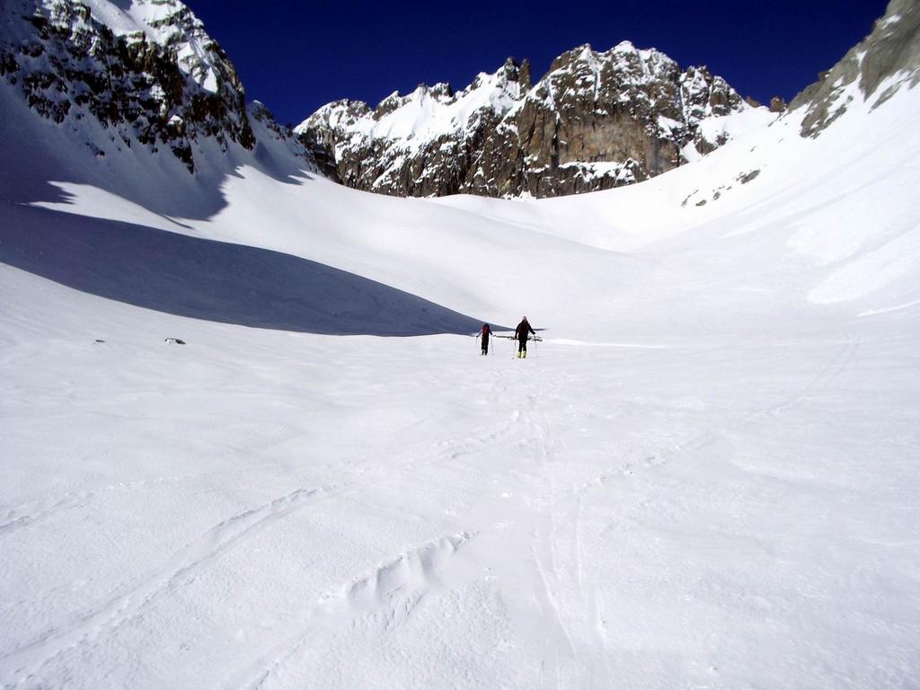 Non siamo scesi per la via di salita, ma per nascosti valloncelli più spostati sulla destra. Qui era bellissima farina, su pendii incontaminati. Particolarmente gradevole…