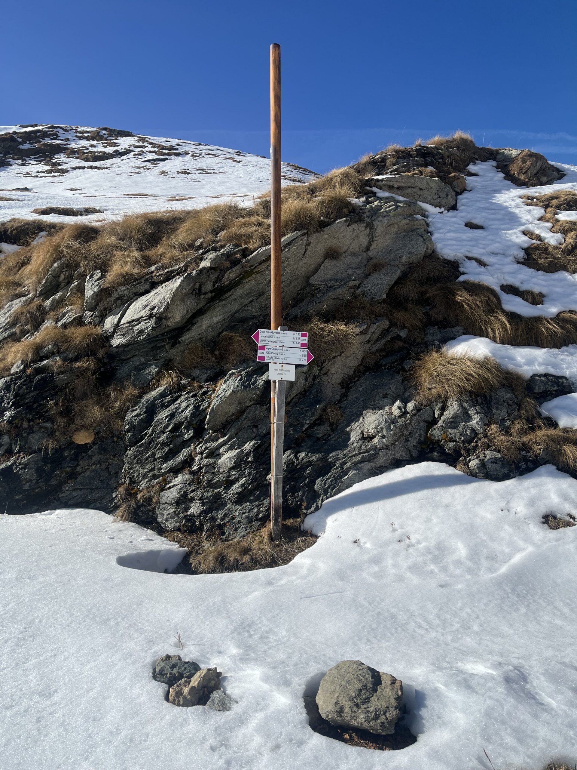 Neve assente salvo un breve tratto nel versante nord , ma salita agevole. Giornata fresca, pioggia in discesa .