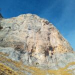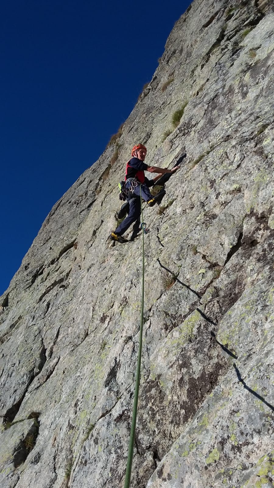 Bella via, con difficoltà ridotte ma protezioni distanziate. A mio parere nessun passaggio superiore al 5a, ma da non sottovalutare. In queste condizioni di secco…