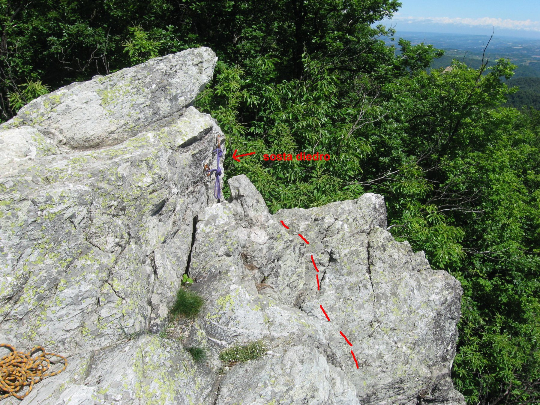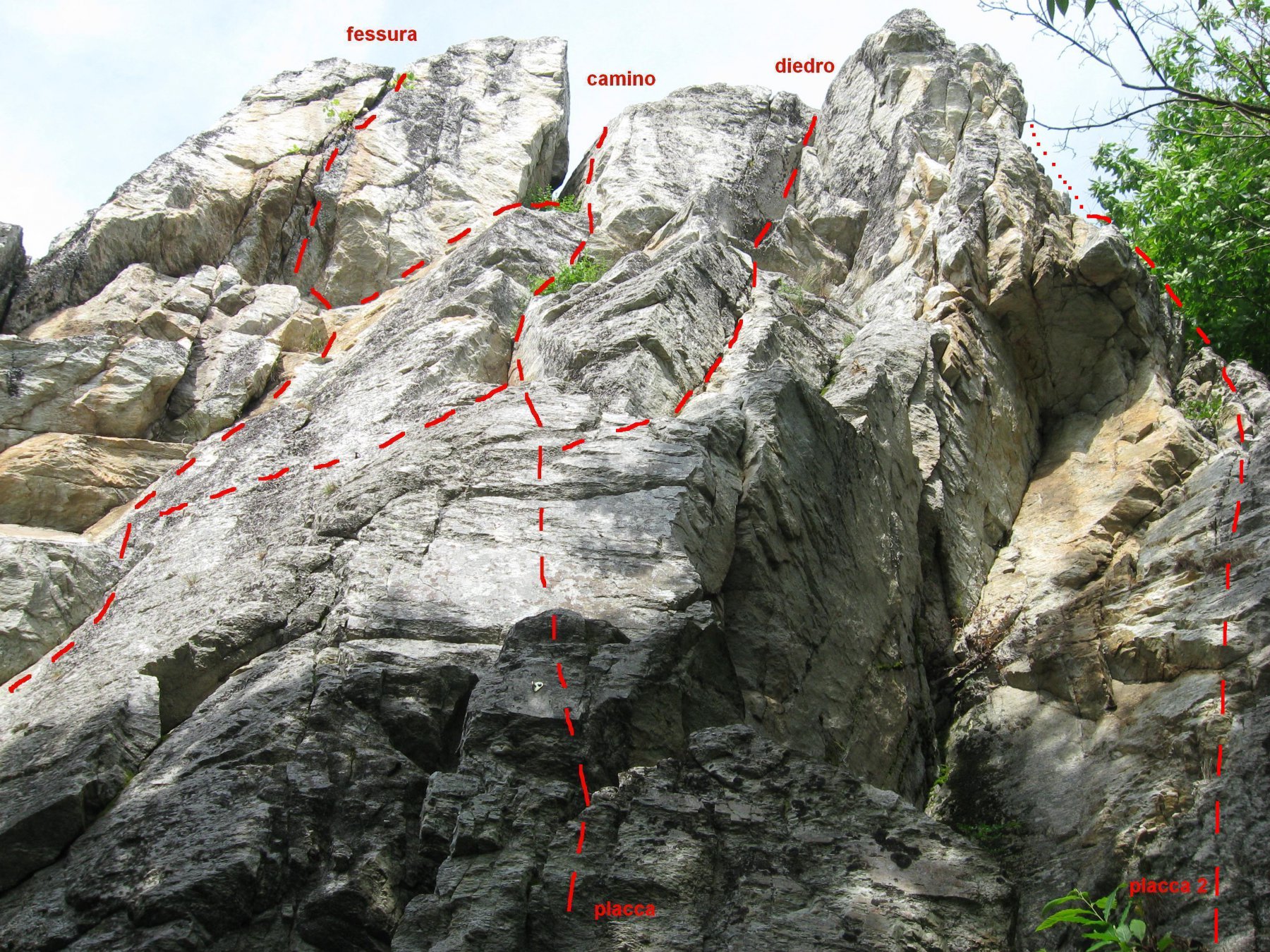 Salito lo sperone alto: lo spigolo è il primo a sin, (30 mt, IV). Poi la fessura (25 mt, V,IV) poi il tetto (30 mt,…