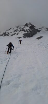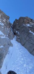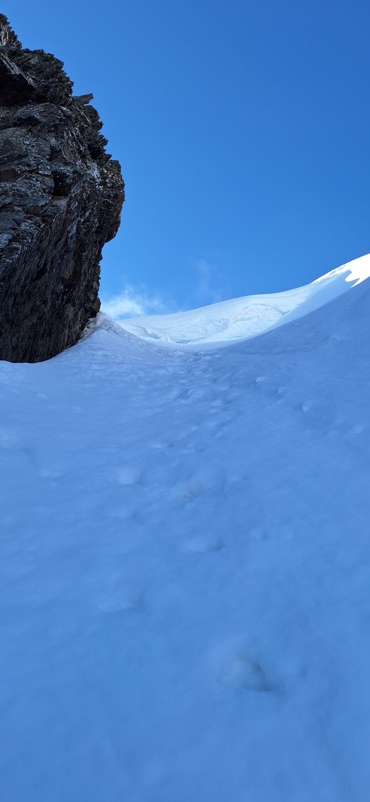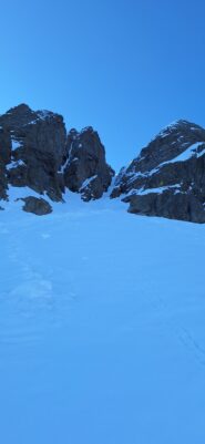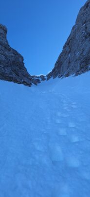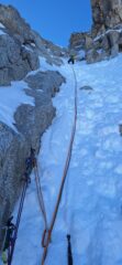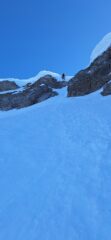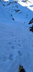 Canale in buone condizioni, interamente su neve con pendenza moderata, molto faticoso l'avvicinamento con neve (ancora tanta) non rigelata.