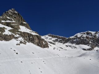 Non tantissima neve (non sciabile il canalino dal colletto, inutile portarsi gli sci in cima) e condizioni da stagione avanzata, nella parte bassa dopo mezzogiorno…