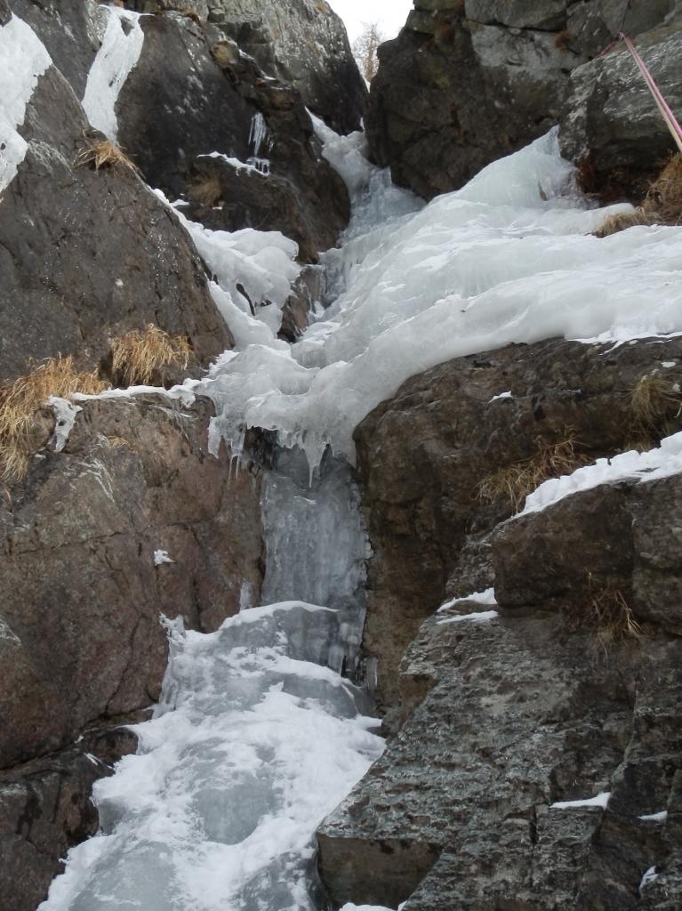 cascata che prende un sacco di sole ed è ormai messa male: ghiaccio granitina, stillicidio di acqua e crepe orizzontali, protezioni assai aleatorie-credo che abbia…