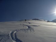 Saliti per l'itinerario sci alpinistico. In basso poco fondo e neve polverosa, in alto buon innevamento, neve molto variabile con prevalenza di crosta non portante.…