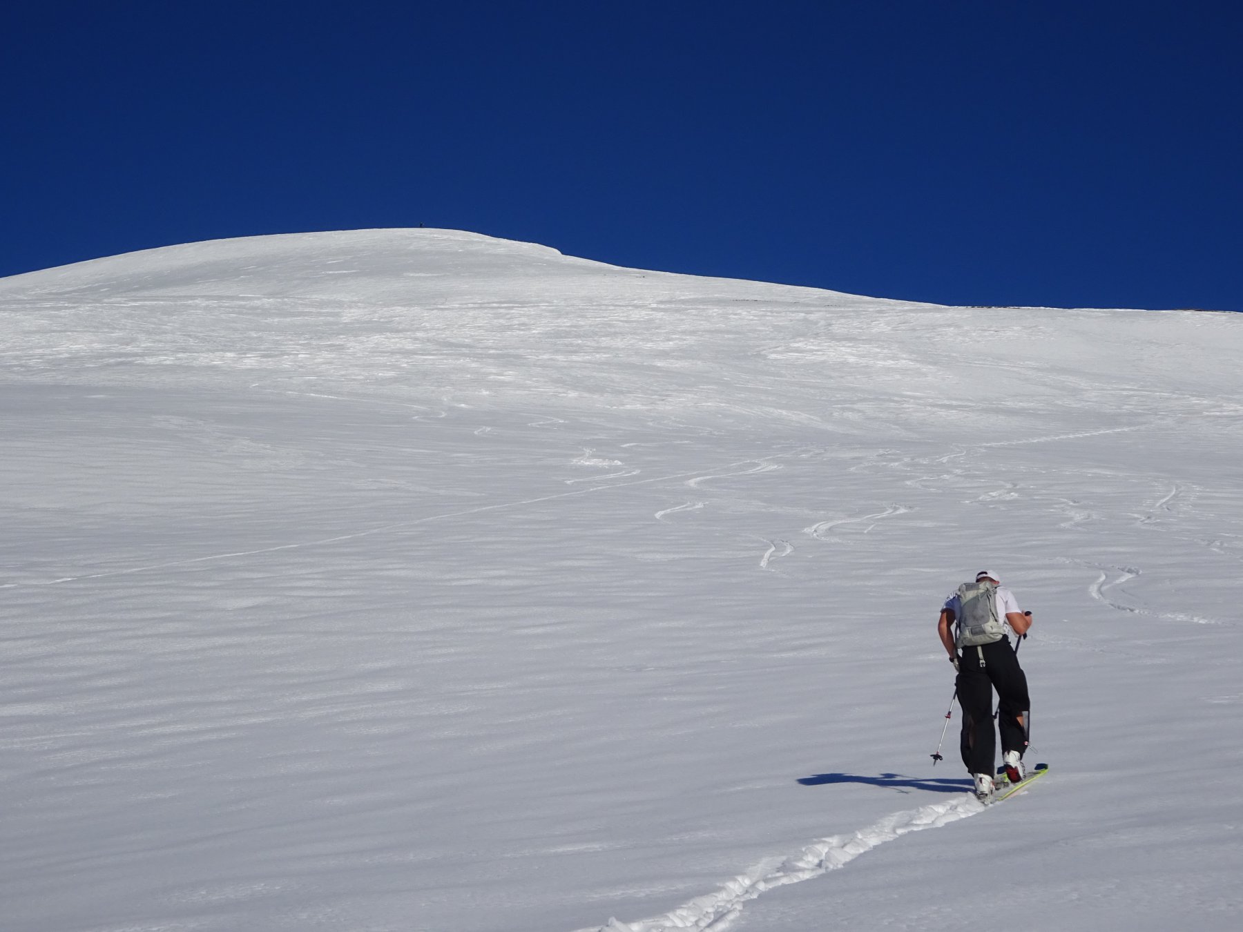 | gondolin | Traccia di salita dove il bosco comincia a diradarsi | gondolin | In vista della cima. Ultima parte di salita sferzata dal vento | gondolin | Arrivo in vetta dopo aver depositato gli sci | gondolin | Sulla stradina di discesa in prossimità delle Mande