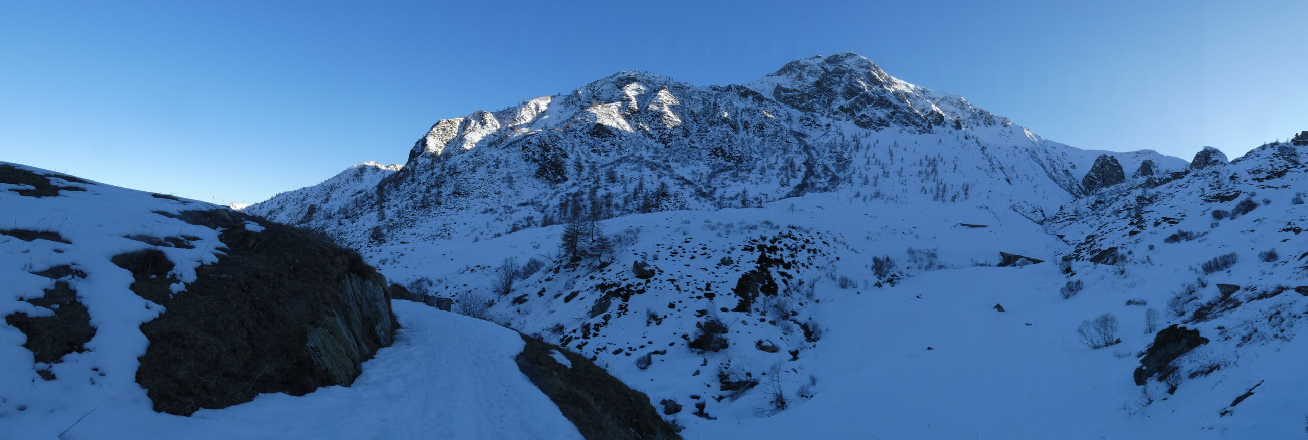 fino sotto alle grange Parvo si cammina senza ciastre. Poi il taglio dei tornanti e la strada hanno un 20 cm di neve per cui…