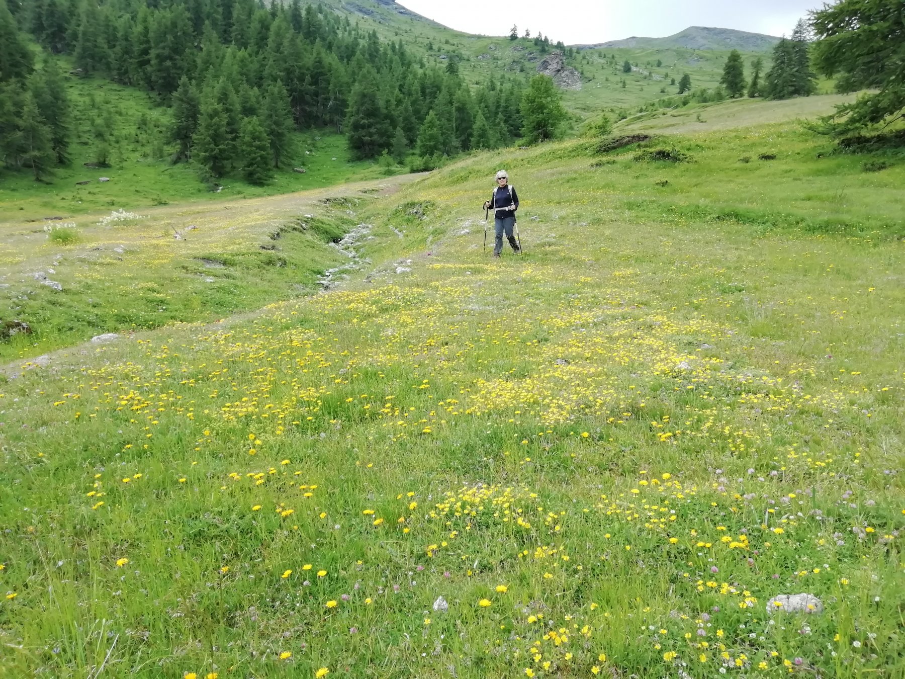 Scesi alle grange Brun dal colletto subito sotto la cima per un pendio ripido e tracce di bestiame. Bella gita e splendida fioritura