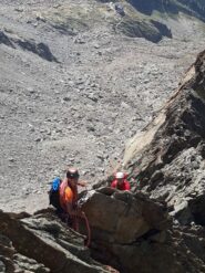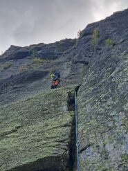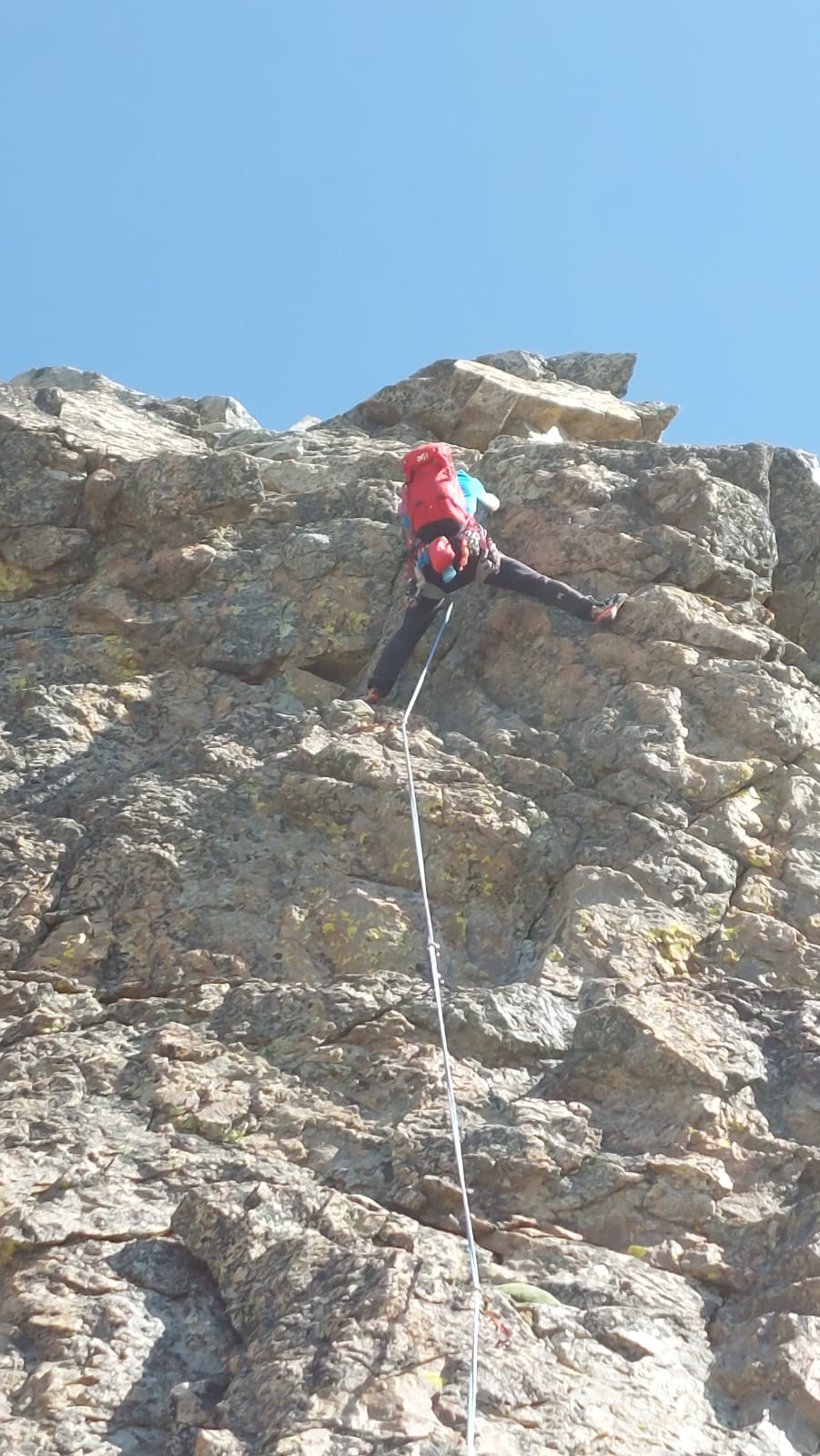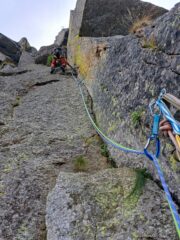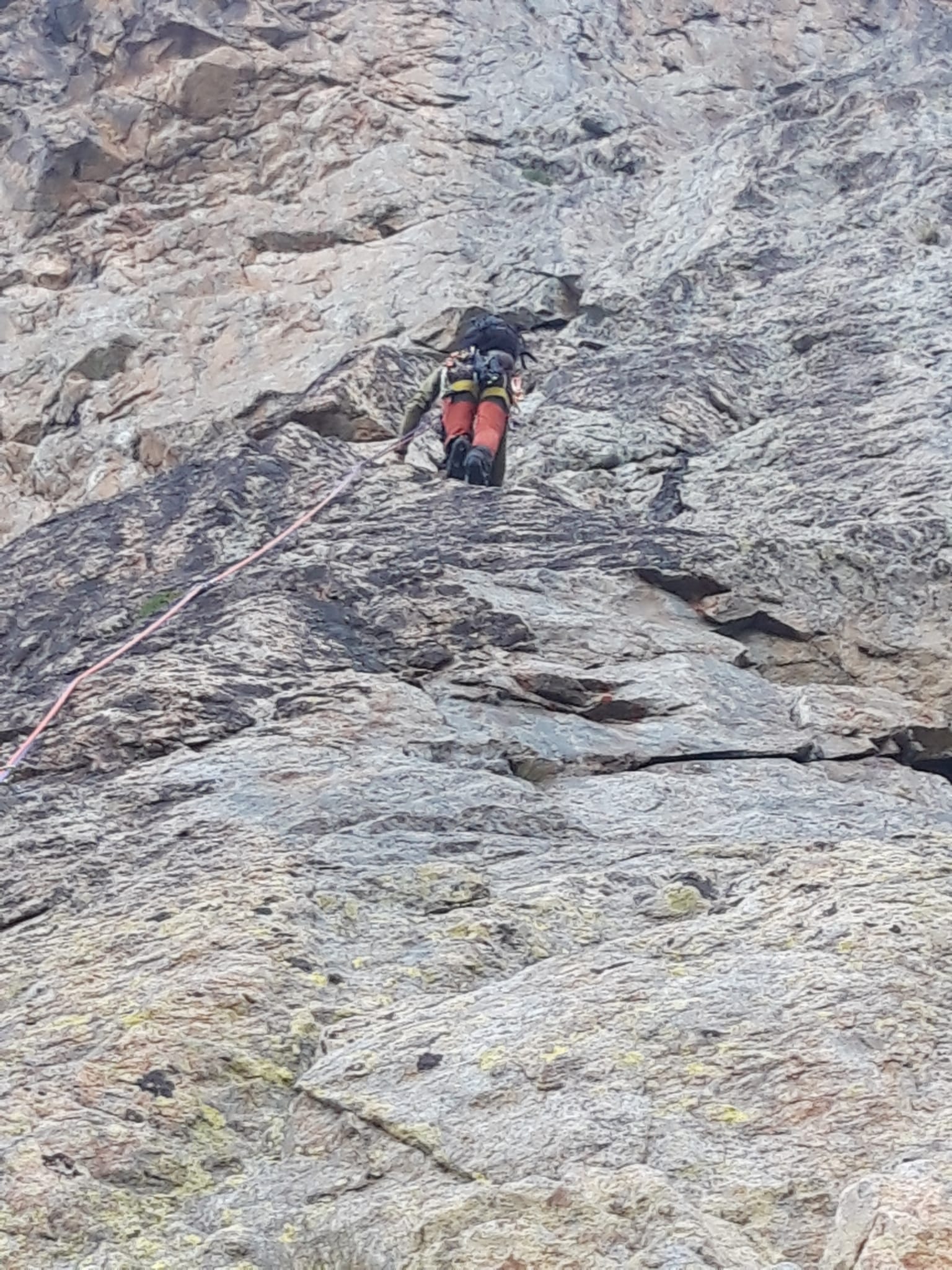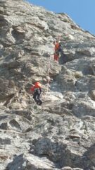 Bella via, che con grande intuito sale la bastionata sulla sinistra del canale dei detriti. Molto belli i primi 4 tiri, dopo il 6° tiro…