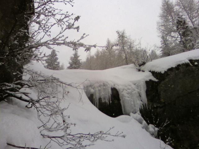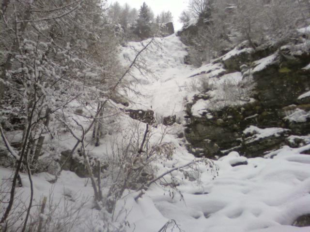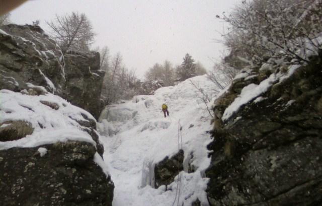 Avvicinamento nella neve fino al ginocchio. Praticamente irriconoscibile data la quantità di neve, è come fare una nord più che una cascata; il ghiaccio misto…