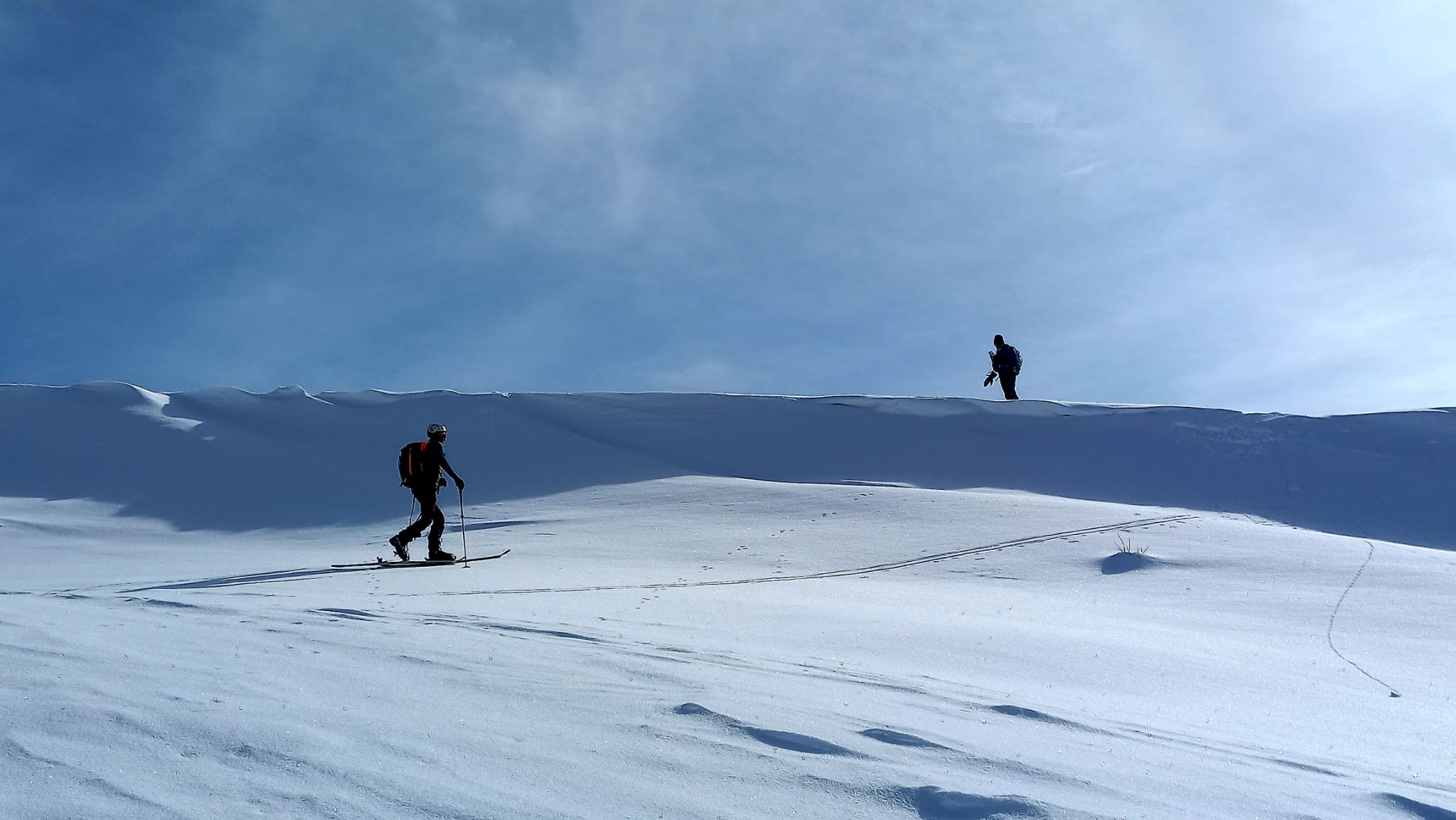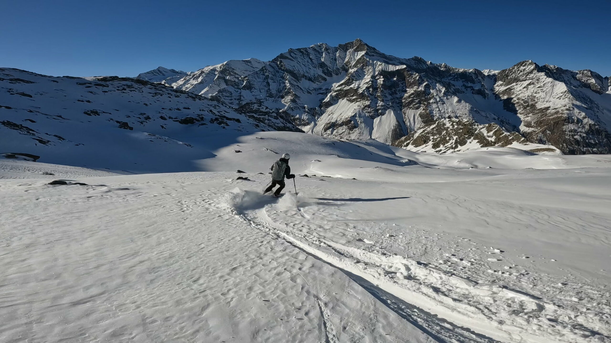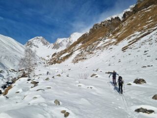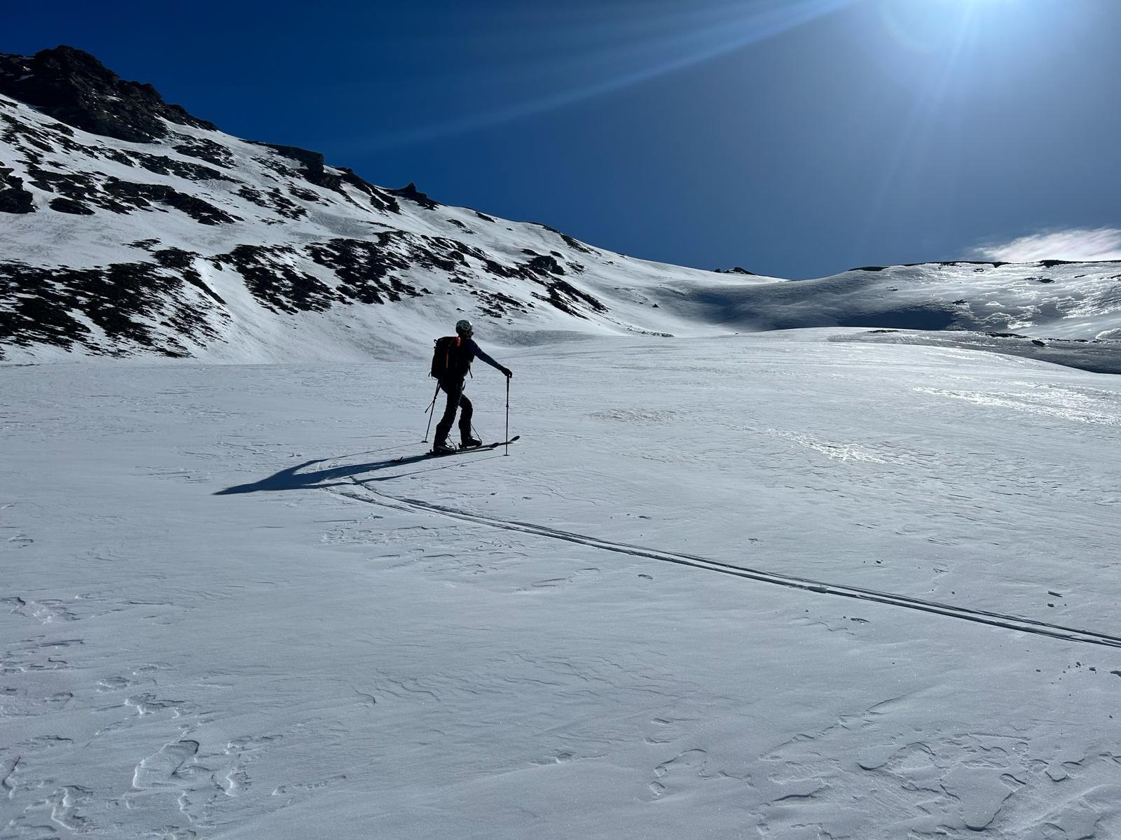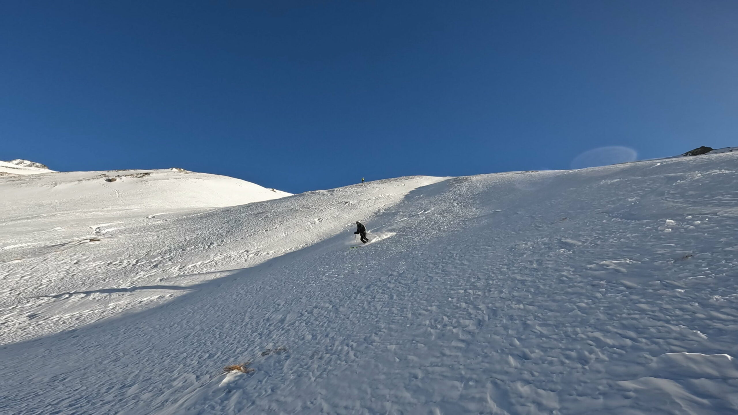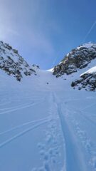 | hheb | Grandi sastrugi a pochi minuti dal colle | hheb | L'ultimo canale sulla dx orografica. | hheb | Ultima parte del largo canale, crosta portante da vento