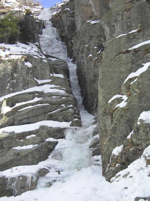 La goulotte si presenta molto magra e lavorata dai frequenti passaggi. Lo strato di ghiaccio in qualche punto è veramente esiguo. La terminale si passa…