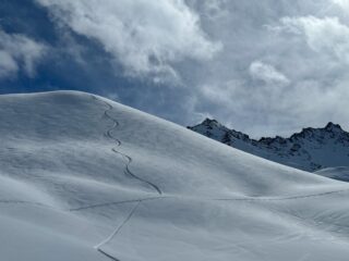 | il-magna | Il vallone la mattina | il-magna | Molte pietre affioranti nella parte alta poco prima del colle | il-magna | Sole e cima spuntano | il-magna | Super pendio | il-magna | Ormai di rientro