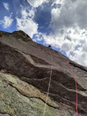Roccia da sogno, tiri ingaggiosi, continuità assoluta, le soste sono scomode vista la totale assenza di cengie da sfruttare. Solo l'ultimo tiro mi ha deluso…