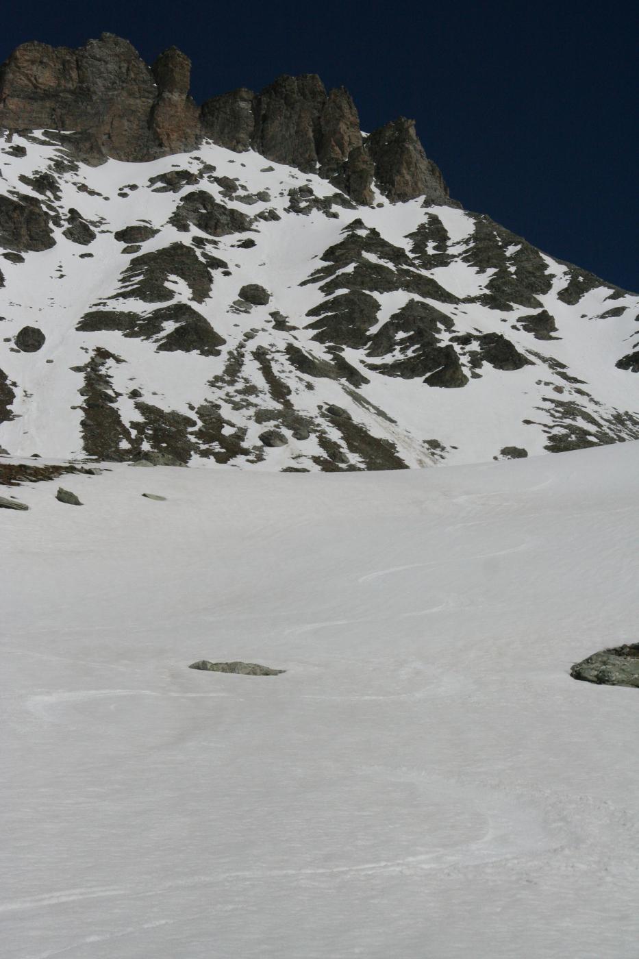 | lakota | Ultimo muro, dove si mettono i ramponi | lakota | firn perfetto, sotto la parte dritta | lakota | la paretina vista dalla Rognosa | lakota | i pendii visti dal colletto