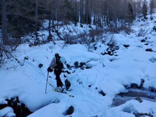 Nel bosco lungo la stradina, neve sufficiente e portante. Dal lago in su tante tracce, neve fresca e nella parte alta un paio di pendii…
