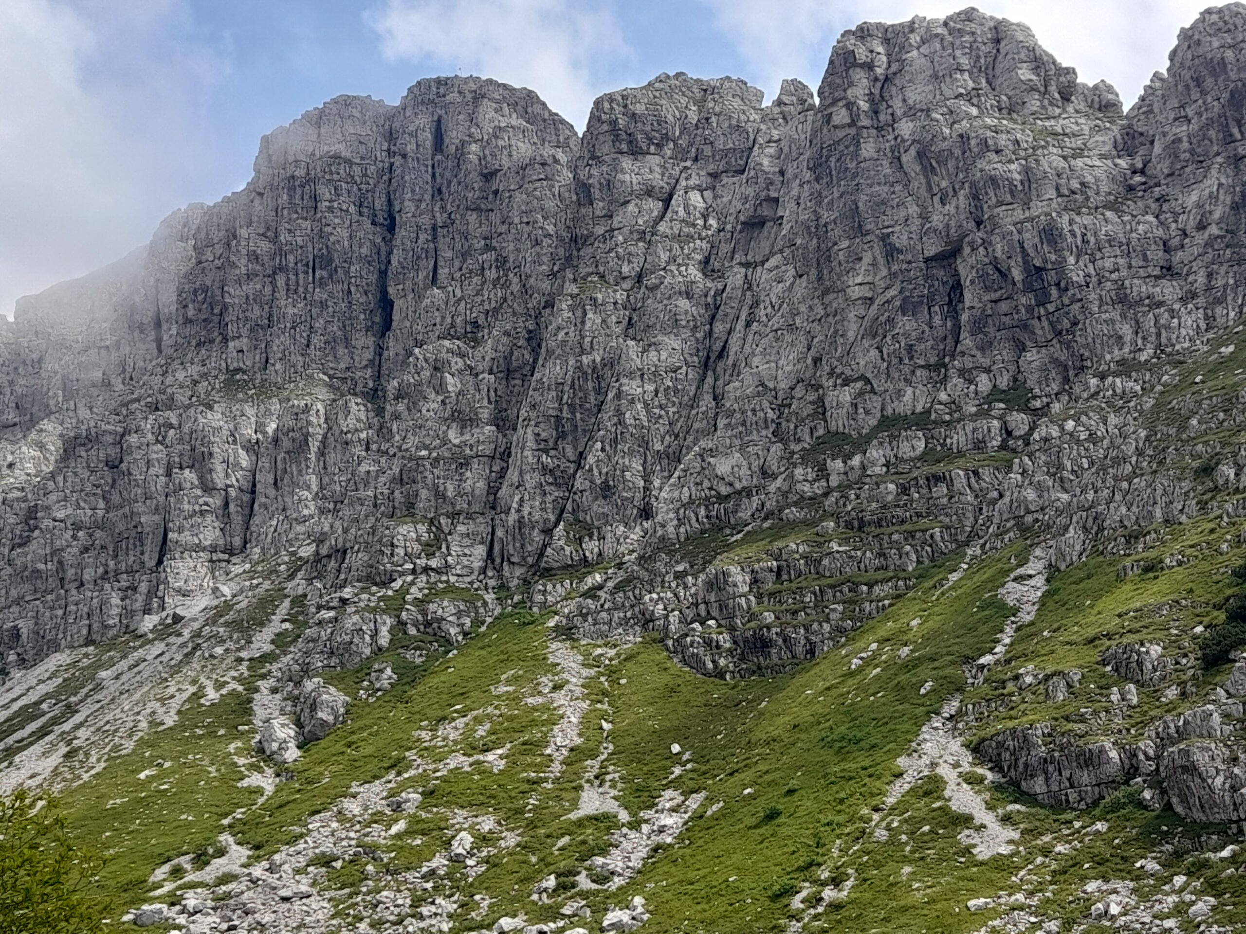 Avvicinamento veloce su sentiero fino a quando non lo si deve abbandonare per avvicinarsi alla parete: da qui ravanage tra rovi e piante cadute. Via…