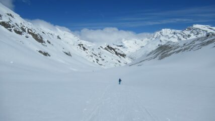 Sciabilita sufficiente. Neve molto lavorata dal vento. Accumuli alternati a marmo in alto, accumuli con crosticina da vento in basso. Bella giornata di sole zero…