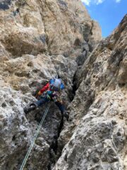 Via da non sottovalutare, non tanto per la difficoltá tecnica, passo chiave di IV a mio avviso V pieno o comunque parecchio fisico (2 chiodi…